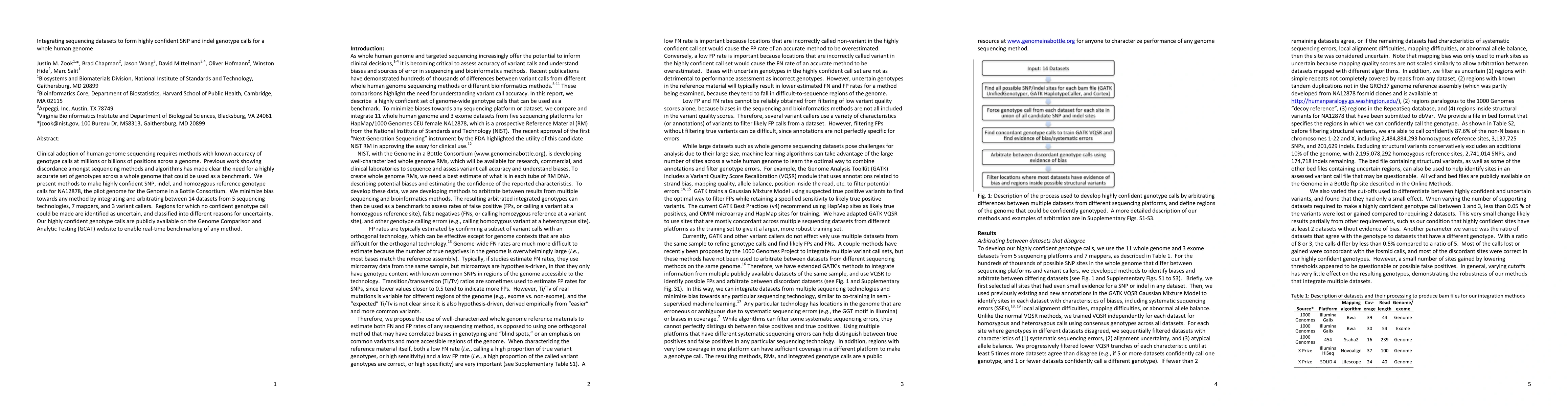 This paper presents methods to integrate sequencing datasets from multiple technologies to generate highly confident SNP and indel genotype calls for the NA12878 genome, minimizing bias through arbitration between 14 datasets. The resulting benchmark data is publicly available for real-time method benchmarking.