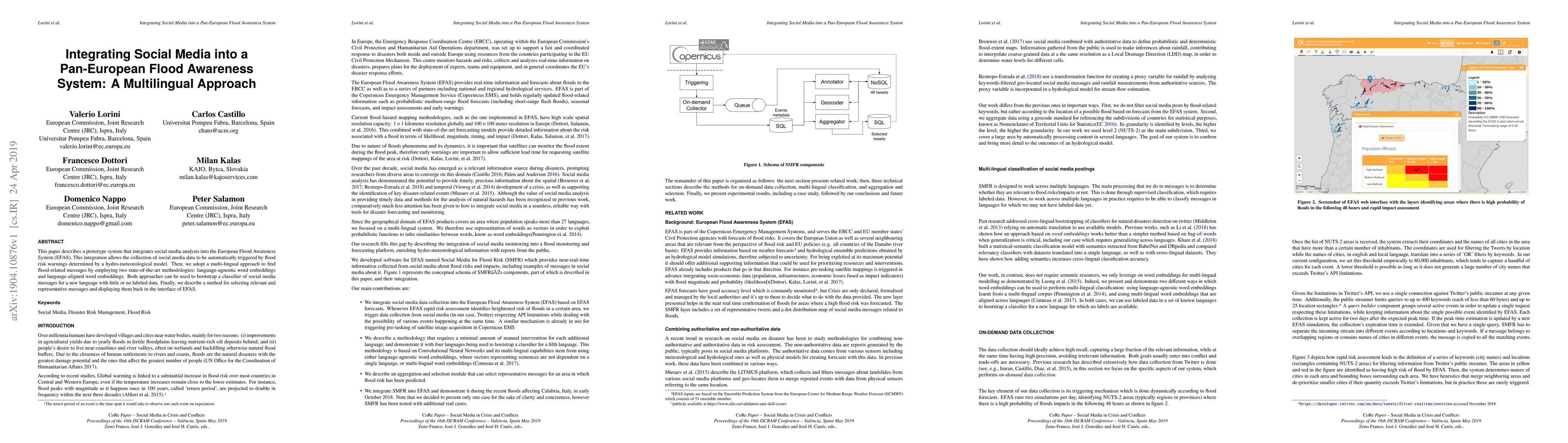This paper presents a prototype system integrating social media analysis into the European Flood Awareness System (EFAS) using a multilingual approach to automatically collect and classify flood-related messages. It employs advanced methodologies to identify relevant messages and display them in the EFAS interface.
