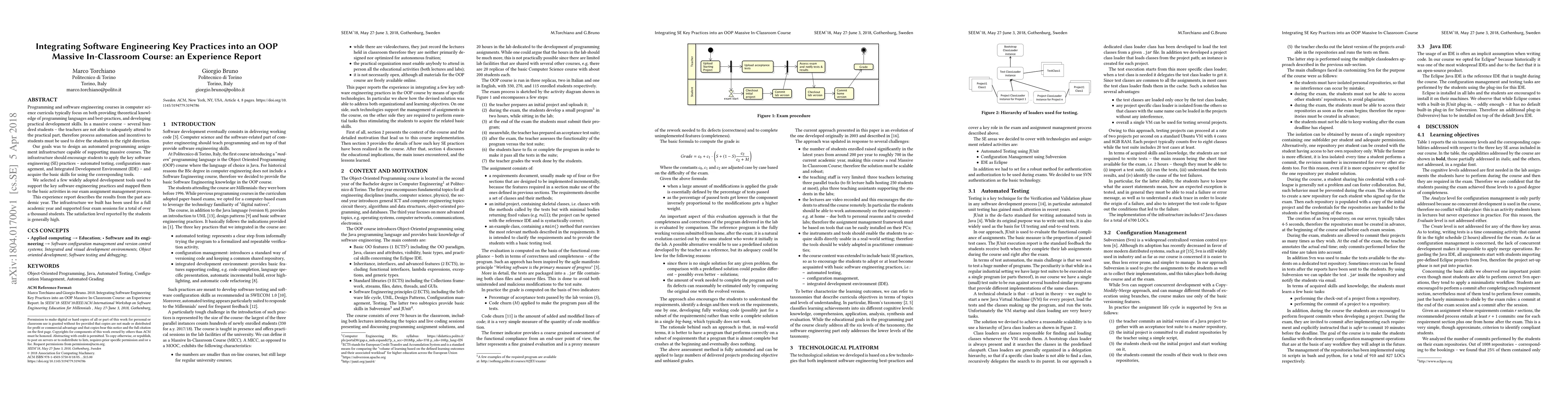 This paper reports on an experience integrating software engineering practices into a massive OOP course, using an automated assignment infrastructure to encourage students to adopt key practices like automated testing and configuration management. The system supported over a thousand students across four exam sessions, with generally high student satisfaction.