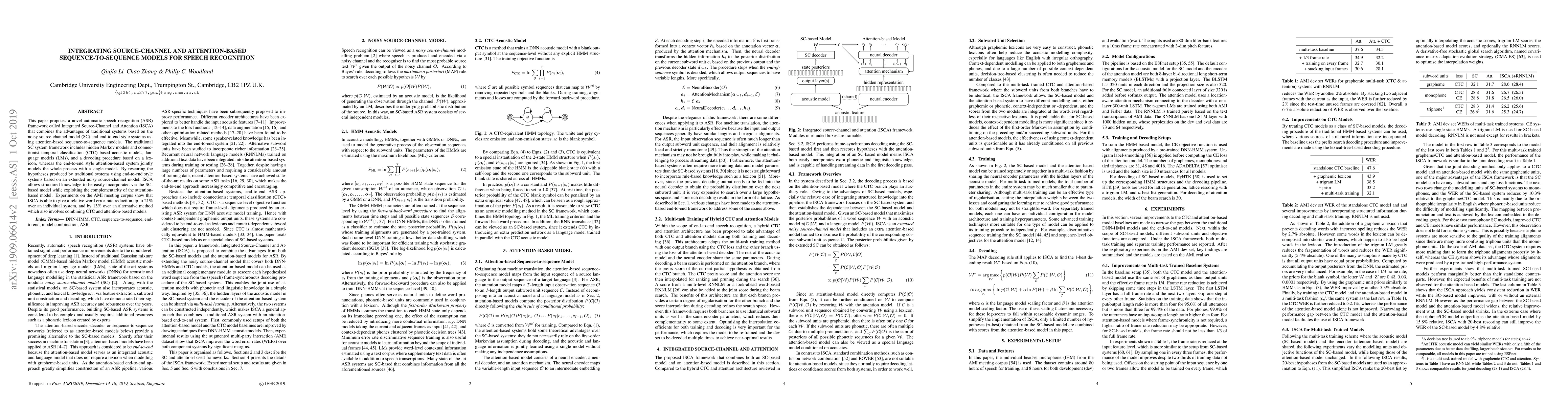 This paper introduces the ISCA framework for automatic speech recognition, combining traditional source-channel models with attention-based sequence-to-sequence techniques for improved performance. Experiments demonstrate a significant reduction in word error rates compared to both standalone systems and alternative hybrid models.