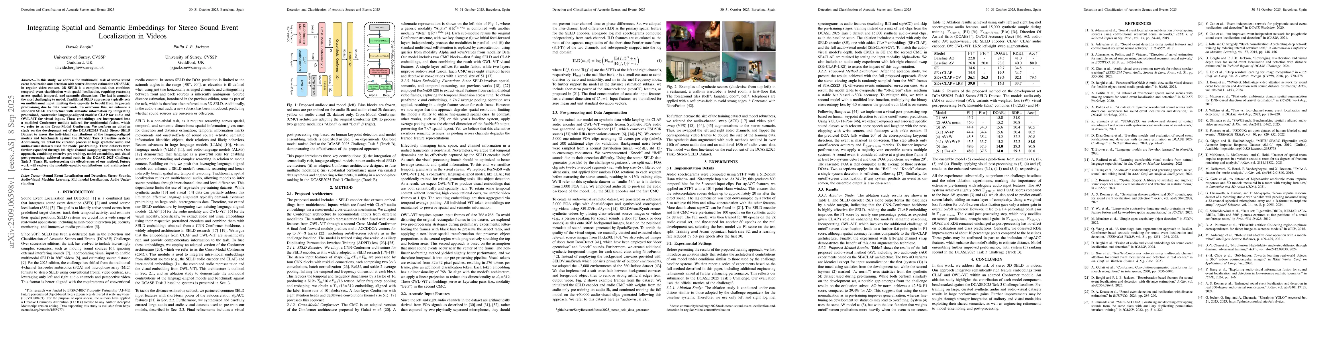 In this study, we address the multimodal task of stereo sound event localization and detection with source distance estimation (3D SELD) in regular video content. 3D SELD is a complex task that combines temporal event classification with spatial localization, requiring reasoning across spatial, temporal, and semantic dimensions. The last is arguably the most challenging to model. Traditional SELD approaches typically rely on multichannel input, limiting their capacity to benefit from large-scale pre-training due to data constraints. To overcome this, we enhance a standard SELD architecture with semantic information by integrating pre-trained, contrastive language-aligned models: CLAP for audio and OWL-ViT for visual inputs. These embeddings are incorporated into a modified Conformer module tailored for multimodal fusion, which we refer to as the Cross-Modal Conformer. We perform an ablation study on the development set of the DCASE2025 Task3 Stereo SELD Dataset to assess the individual contributions of the language-aligned models and benchmark against the DCASE Task 3 baseline systems. Additionally, we detail the curation process of large synthetic audio and audio-visual datasets used for model pre-training. These datasets were further expanded through left-right channel swapping augmentation. Our approach, combining extensive pre-training, model ensembling, and visual post-processing, achieved second rank in the DCASE 2025 Challenge Task 3 (Track B), underscoring the effectiveness of our method. Future work will explore the modality-specific contributions and architectural refinements.
