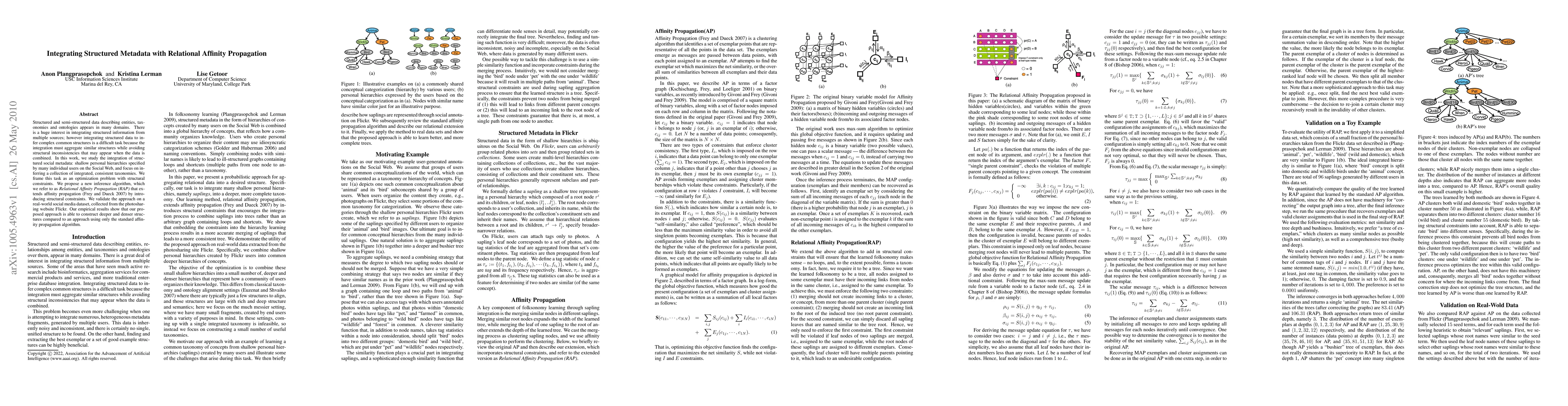 This paper proposes a new algorithm called Relational Affinity Propagation (RAP) to integrate structured social metadata from multiple sources, aiming to infer consistent taxonomies. The results show that RAP constructs deeper and denser structures compared to standard affinity propagation, validated on a dataset from Flickr.
