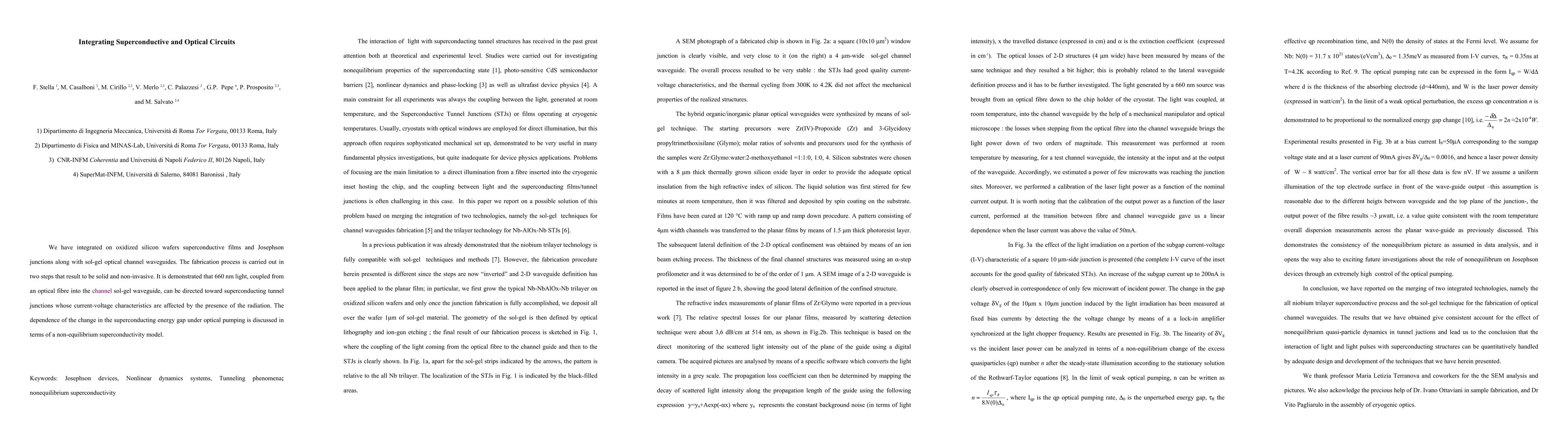We have integrated on oxidized silicon wafers superconductive films and Josephson junctions along with sol-gel optical channel waveguides. The fabrication process is carried out in two steps that result to be solid and non-invasive. It is demonstrated that 660 nm light, coupled from an optical fibre into the channel sol-gel waveguide, can be directed toward superconducting tunnel junctions whose current-voltage characteristics are affected by the presence of the radiation. The dependence of the change in the superconducting energy gap under optical pumping is discussed in terms of a non-equilibrium superconductivity model.