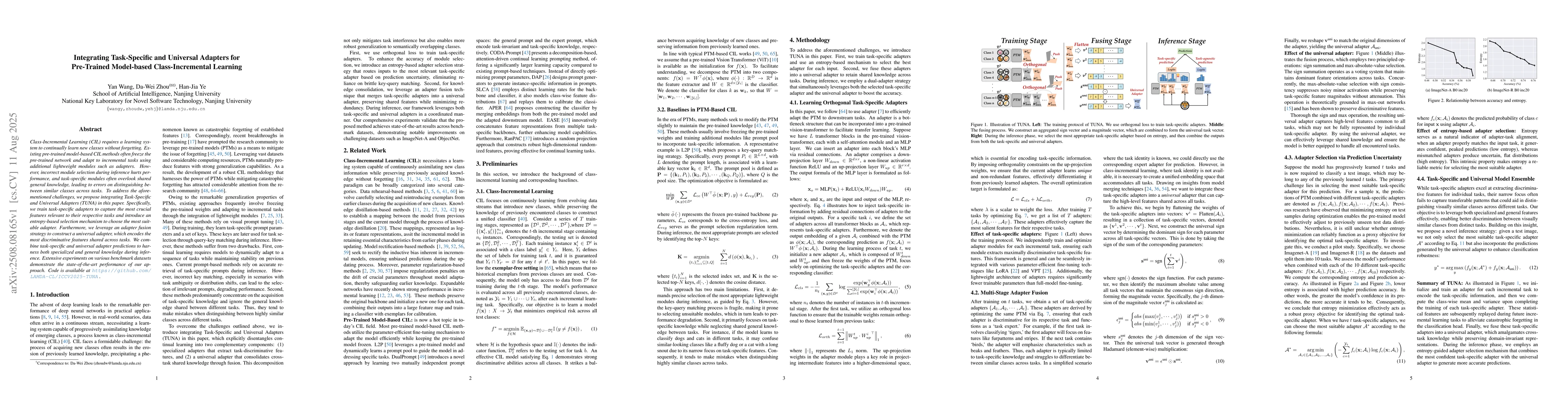 The paper proposes TUNA, a method that integrates Task-Specific and Universal Adapters for pre-trained model-based Class-Incremental Learning (CIL). TUNA trains task-specific adapters for distinct features and introduces an entropy-based selection mechanism for choosing the most suitable adapter. It also constructs a universal adapter via adapter fusion to encode shared knowledge across tasks.