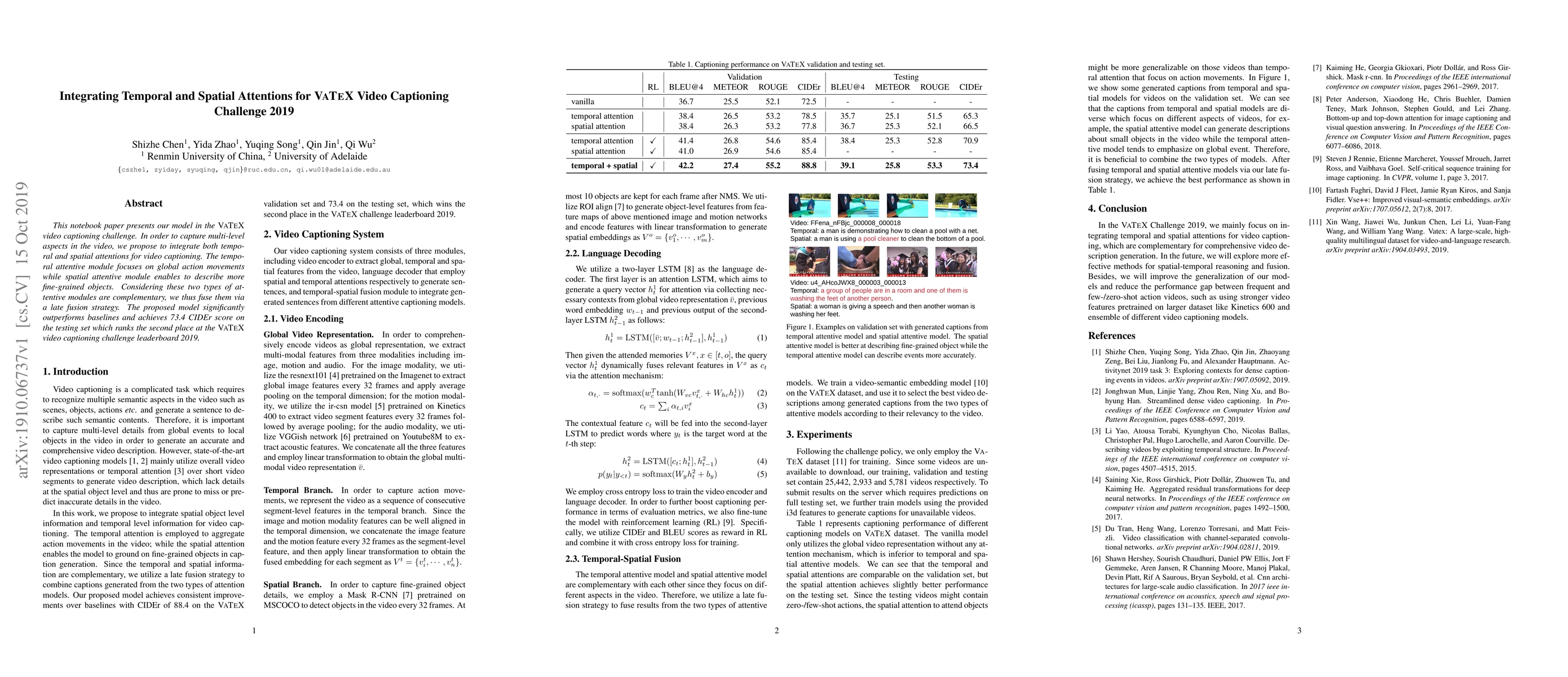 This paper proposes a model integrating temporal and spatial attentions for VATEX video captioning, achieving a 73.4 CIDEr score and ranking second in the 2019 challenge. The model uses temporal attention for global action movements and spatial attention for fine-grained objects, fused via late fusion for superior performance.