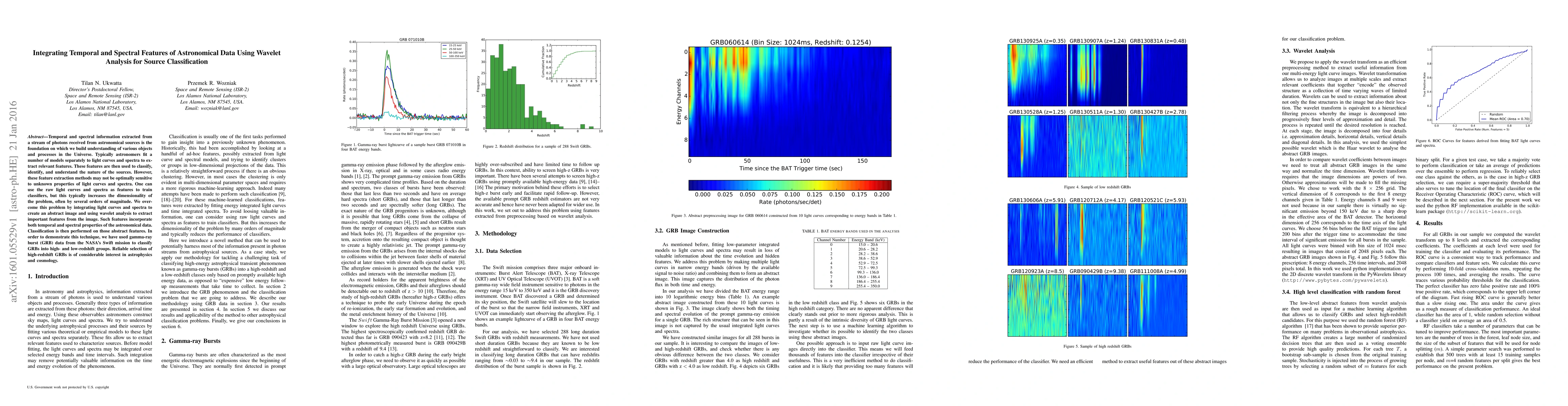 Temporal and spectral information extracted from a stream of photons received from astronomical sources is the foundation on which we build understanding of various objects and processes in the Universe. Typically astronomers fit a number of models separately to light curves and spectra to extract relevant features. These features are then used to classify, identify, and understand the nature of the sources. However, these feature extraction methods may not be optimally sensitive to unknown properties of light curves and spectra. One can use the raw light curves and spectra as features to train classifiers, but this typically increases the dimensionality of the problem, often by several orders of magnitude. We overcome this problem by integrating light curves and spectra to create an abstract image and using wavelet analysis to extract important features from the image. Such features incorporate both temporal and spectral properties of the astronomical data. Classification is then performed on those abstract features. In order to demonstrate this technique, we have used gamma-ray burst (GRB) data from the NASA's Swift mission to classify GRBs into high- and low-redshift groups. Reliable selection of high-redshift GRBs is of considerable interest in astrophysics and cosmology.