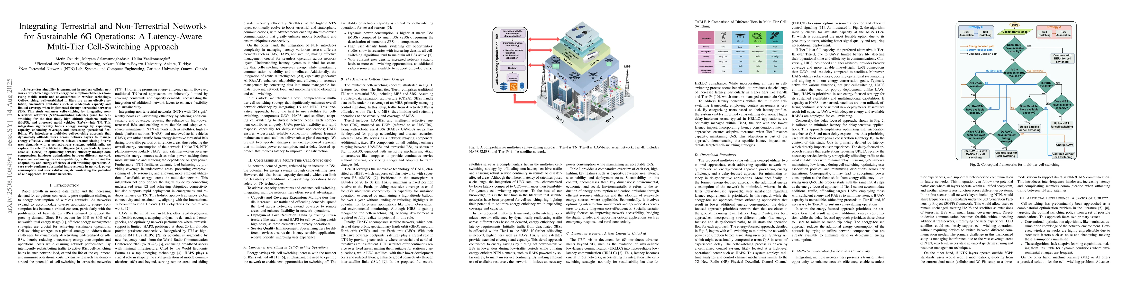 Sustainability is paramount in modern cellular networks, which face significant energy consumption challenges from rising mobile traffic and advancements in wireless technology. Cell-switching, well-established in literature as an effective solution, encounters limitations such as inadequate capacity and limited coverage when implemented through terrestrial networks (TN). This study enhances cell-switching by integrating non-terrestrial networks (NTN), including satellites (used for cell-switching for the first time), high altitude platform stations (HAPS), and uncrewed aerial vehicles (UAVs) into TN. This integration significantly boosts energy savings by expanding capacity, enhancing coverage, and increasing operational flexibility. We introduce a multi-tier cell-switching approach that dynamically offloads users across network layers to manage energy effectively and minimize delays, accommodating diverse user demands with a context aware strategy. Additionally, we explore the role of artificial intelligence (AI), particularly generative AI, in optimizing network efficiency through data compression, handover optimization between different network layers, and enhancing device compatibility, further improving the adaptability and energy efficiency of cell-switching operations. A case study confirms substantial improvements in network power consumption and user satisfaction, demonstrating the potential of our approach for future networks.
