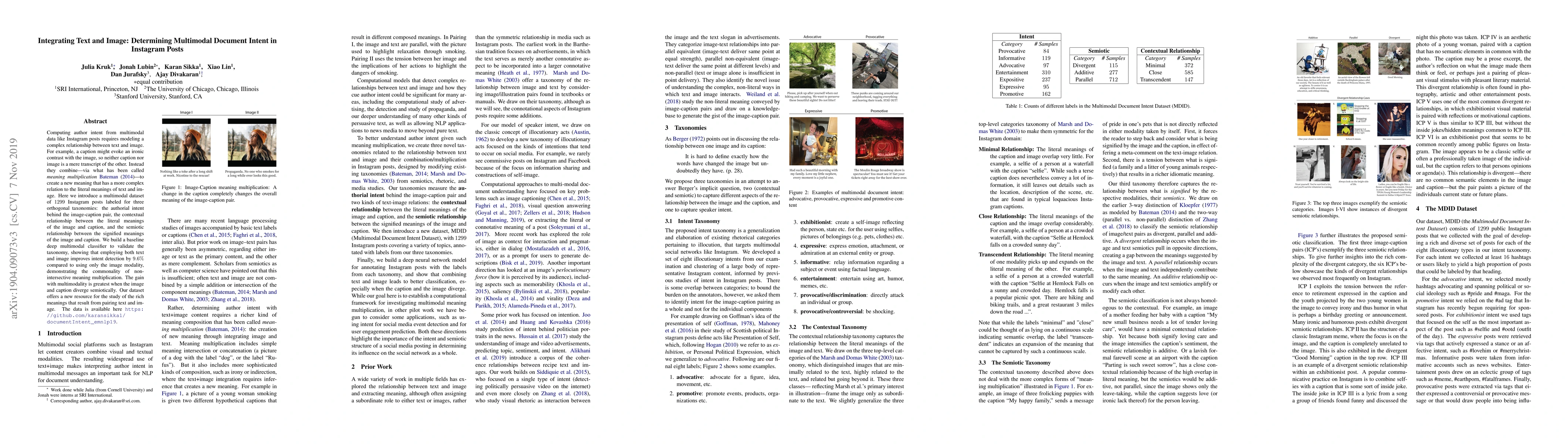 Computing author intent from multimodal data like Instagram posts requires modeling a complex relationship between text and image. For example, a caption might evoke an ironic contrast with the image, so neither caption nor image is a mere transcript of the other. Instead they combine -- via what has been called meaning multiplication -- to create a new meaning that has a more complex relation to the literal meanings of text and image. Here we introduce a multimodal dataset of 1299 Instagram posts labeled for three orthogonal taxonomies: the authorial intent behind the image-caption pair, the contextual relationship between the literal meanings of the image and caption, and the semiotic relationship between the signified meanings of the image and caption. We build a baseline deep multimodal classifier to validate the taxonomy, showing that employing both text and image improves intent detection by 9.6% compared to using only the image modality, demonstrating the commonality of non-intersective meaning multiplication. The gain with multimodality is greatest when the image and caption diverge semiotically. Our dataset offers a new resource for the study of the rich meanings that result from pairing text and image.