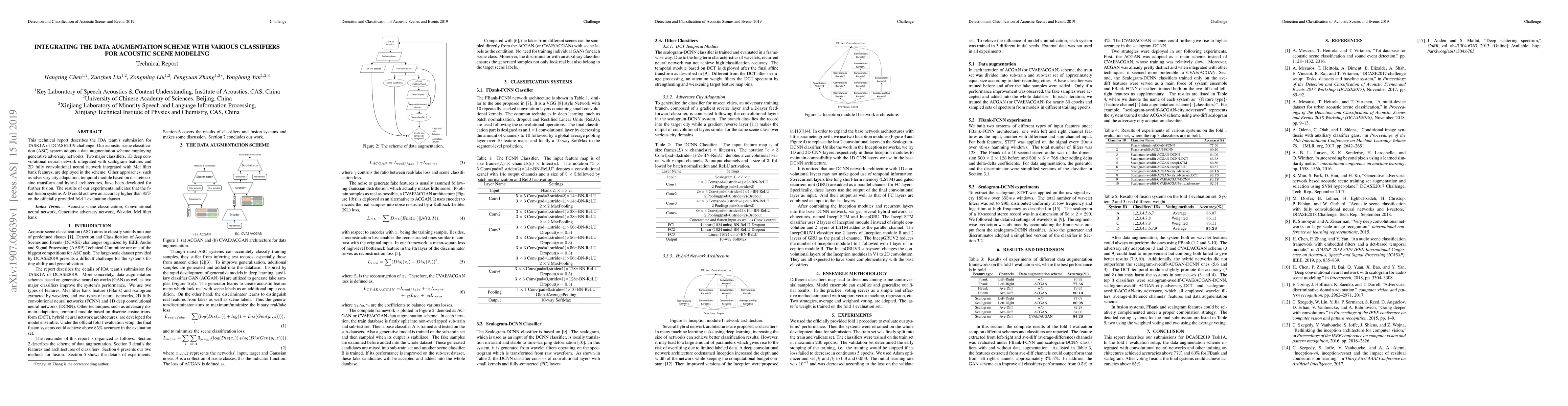 This technical report describes the IOA team's submission for TASK1A of DCASE2019 challenge. Our acoustic scene classification (ASC) system adopts a data augmentation scheme employing generative adversary networks. Two major classifiers, 1D deep convolutional neural network integrated with scalogram features and 2D fully convolutional neural network integrated with Mel filter bank features, are deployed in the scheme. Other approaches, such as adversary city adaptation, temporal module based on discrete cosine transform and hybrid architectures, have been developed for further fusion. The results of our experiments indicates that the final fusion systems A-D could achieve an accuracy higher than 85% on the officially provided fold 1 evaluation dataset.