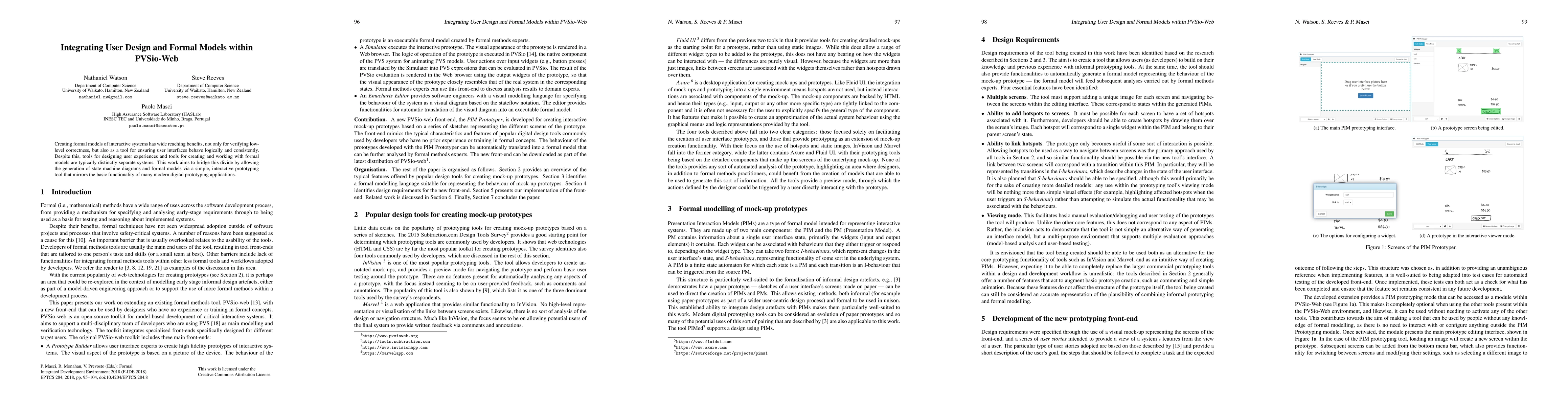 This paper proposes integrating user design and formal model creation within PVSio-Web, aiming to bridge the gap between user experience prototyping and formal model verification through an interactive tool that generates state machine diagrams and formal models. This approach ensures logical and consistent user interface behavior.