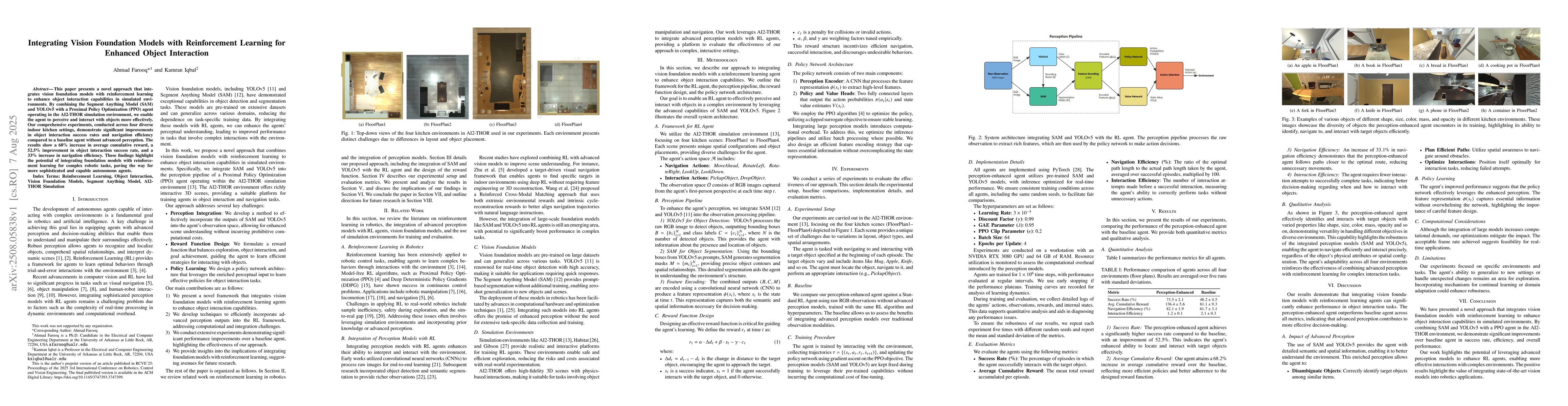 This paper presents a novel approach that integrates vision foundation models with reinforcement learning to enhance object interaction capabilities in simulated environments. By combining the Segment Anything Model (SAM) and YOLOv5 with a Proximal Policy Optimization (PPO) agent operating in the AI2-THOR simulation environment, we enable the agent to perceive and interact with objects more effectively. Our comprehensive experiments, conducted across four diverse indoor kitchen settings, demonstrate significant improvements in object interaction success rates and navigation efficiency compared to a baseline agent without advanced perception. The results show a 68% increase in average cumulative reward, a 52.5% improvement in object interaction success rate, and a 33% increase in navigation efficiency. These findings highlight the potential of integrating foundation models with reinforcement learning for complex robotic tasks, paving the way for more sophisticated and capable autonomous agents.