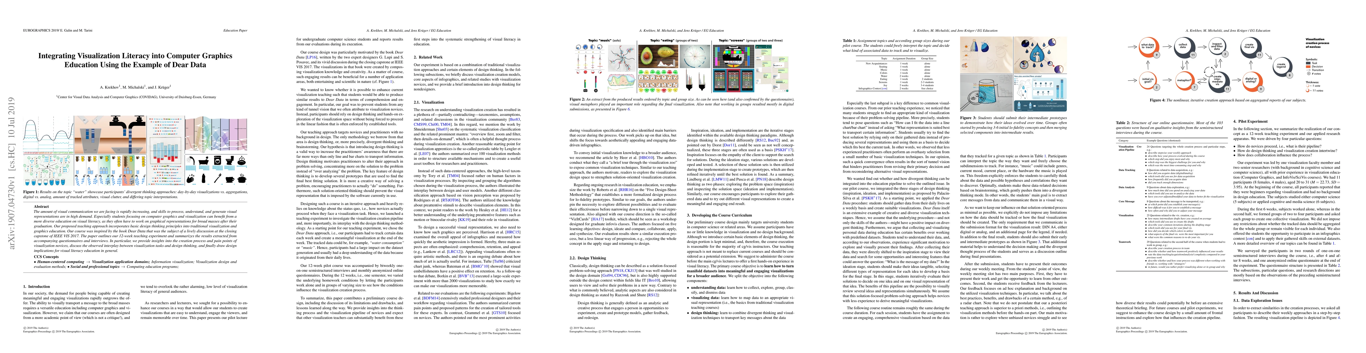 The amount of visual communication we are facing is rapidly increasing, and skills to process, understand, and generate visual representations are in high demand. Especially students focusing on computer graphics and visualization can benefit from a more diverse education on visual literacy, as they often have to work on graphical representations for broad masses after their graduation. Our proposed teaching approach incorporates basic design thinking principles into traditional visualization and graphics education. Our course was inspired by the book Dear Data that was the subject of a lively discussion at the closing capstone of IEEE VIS 2017. The paper outlines our 12-week teaching experiment and summarizes the results extracted from accompanying questionnaires and interviews. In particular, we provide insights into the creation process and pain points of visualization novices, discuss the observed interplay between visualization tasks and design thinking, and finally draw design implications for visual literacy education in general.