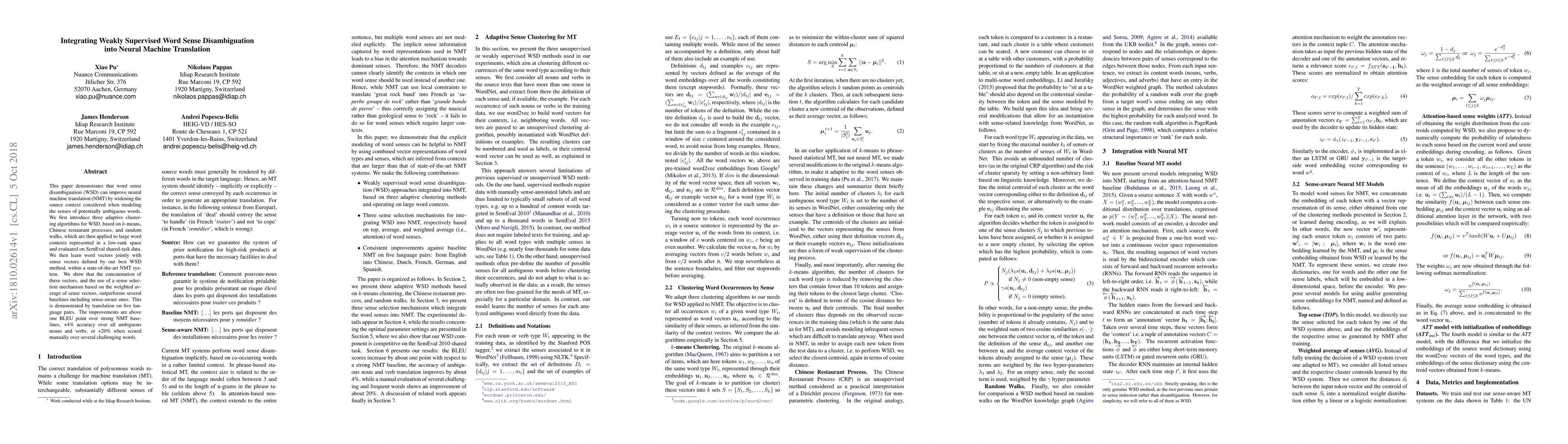 This paper integrates weakly supervised word sense disambiguation (WSD) into neural machine translation (NMT) to enhance translation quality. It employs adaptive clustering algorithms for WSD, which are then used to model ambiguous words in a low-rank space, leading to significant improvements over baselines in translation accuracy and BLEU scores.