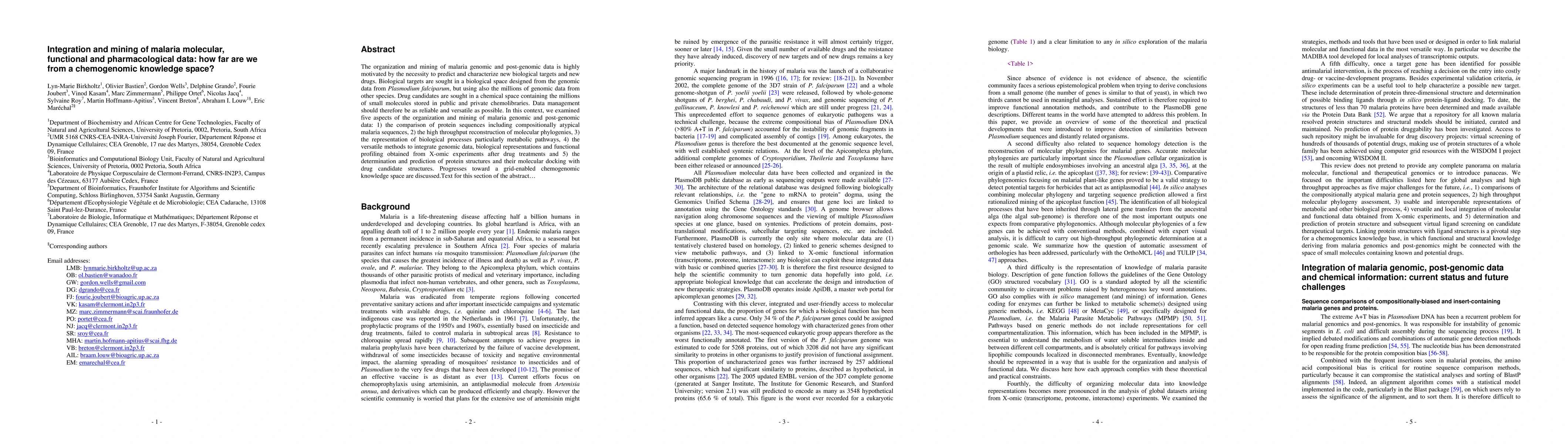 This paper explores the integration and mining of malaria genomic and post-genomic data to predict new biological targets and drugs, focusing on sequence comparison, molecular phylogenies, biological process representation, and protein structure prediction. It discusses the progress towards creating a chemogenomic knowledge space.