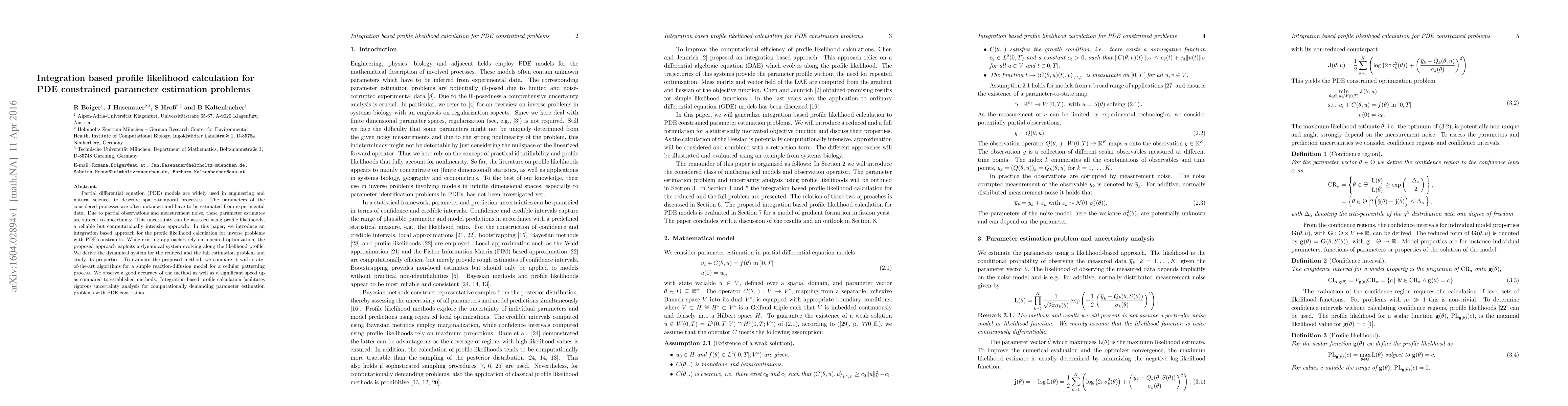 Partial differential equation (PDE) models are widely used in engineering and natural sciences to describe spatio-temporal processes. The parameters of the considered processes are often unknown and have to be estimated from experimental data. Due to partial observations and measurement noise, these parameter estimates are subject to uncertainty. This uncertainty can be assessed using profile likelihoods, a reliable but computationally intensive approach. In this paper, we introduce an integration based approach for the profile likelihood calculation for inverse problems with PDE constraints. While existing approaches rely on repeated optimization, the proposed approach exploits a dynamical system evolving along the likelihood profile. We derive the dynamical system for the reduced and the full estimation problem and study its properties. To evaluate the proposed method, we compare it with state-of-the-art algorithms for a simple reaction-diffusion model for a cellular patterning process. We observe a good accuracy of the method as well as a significant speed up as compared to established methods. Integration based profile calculation facilitates rigorous uncertainty analysis for computationally demanding parameter estimation problems with PDE constraints.