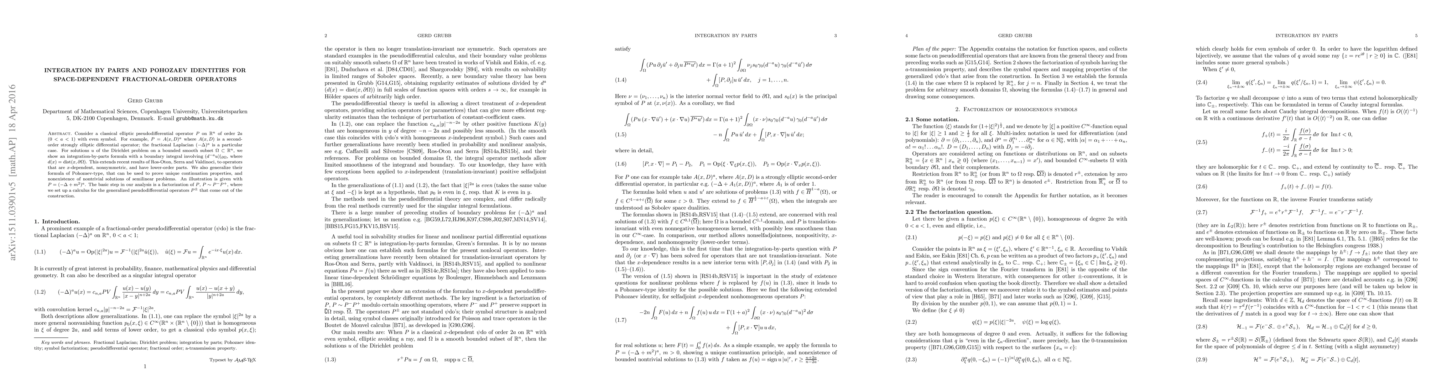 This paper extends integration-by-parts formulas and Pohozaev identities to space-dependent fractional-order operators, including $x$-dependent, nonsymmetric cases. The analysis involves a factorization of the operators and a new calculus for generalized pseudodifferential operators.