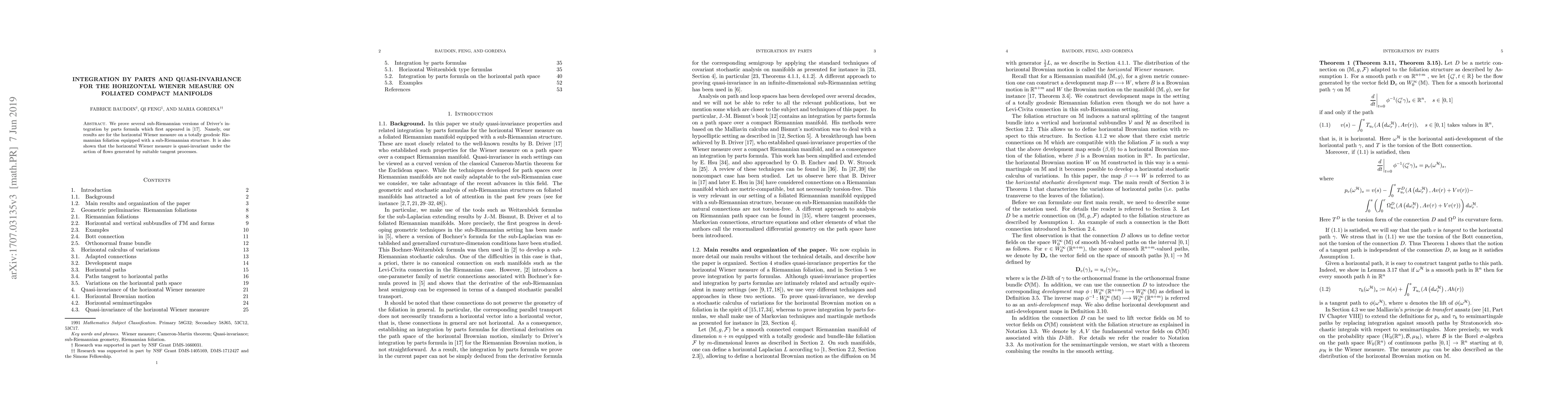 Summary: This paper establishes Driver's integration by parts formula for the horizontal Wiener measure on a Riemannian foliation and demonstrates the quasi-invariance of this measure under flows driven by tangent processes.