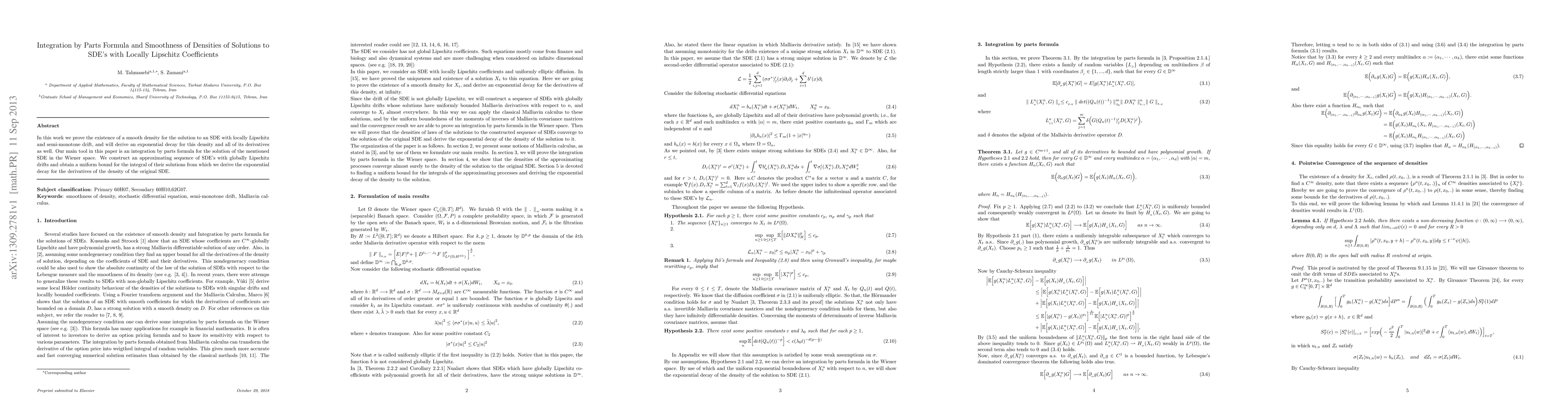 This paper proves the existence of a smooth density for solutions to SDEs with locally Lipschitz coefficients and derives an exponential decay for this density and its derivatives. The key tool is an integration by parts formula in Wiener space, supported by an approximating sequence of SDEs with globally Lipschitz drifts.