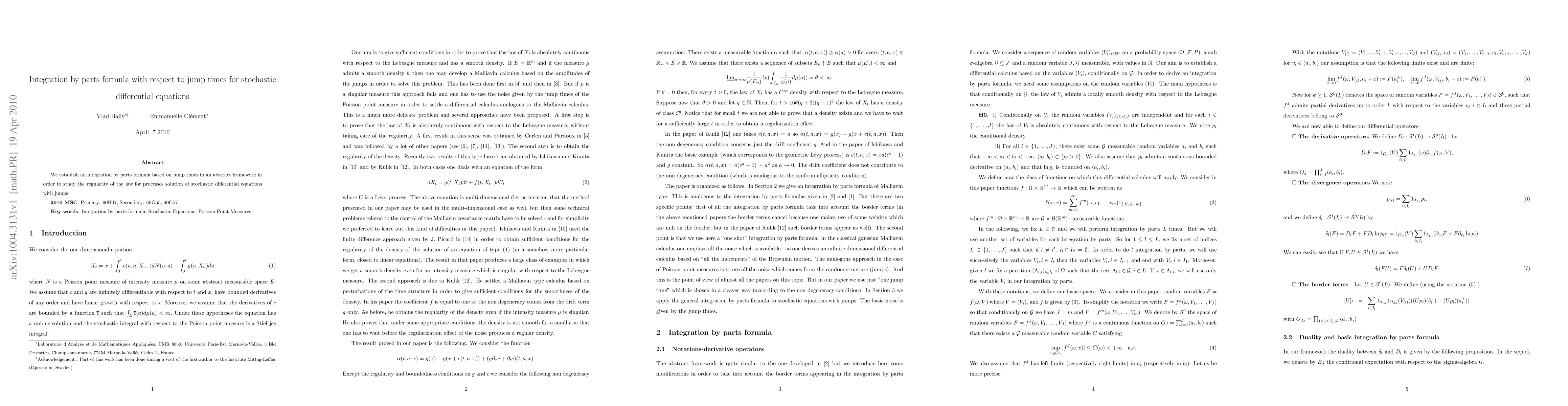 Summary: This paper establishes an integration by parts formula for stochastic differential equations with jumps, focusing on the regularity of the solution's law through the use of jump times in an abstract framework.