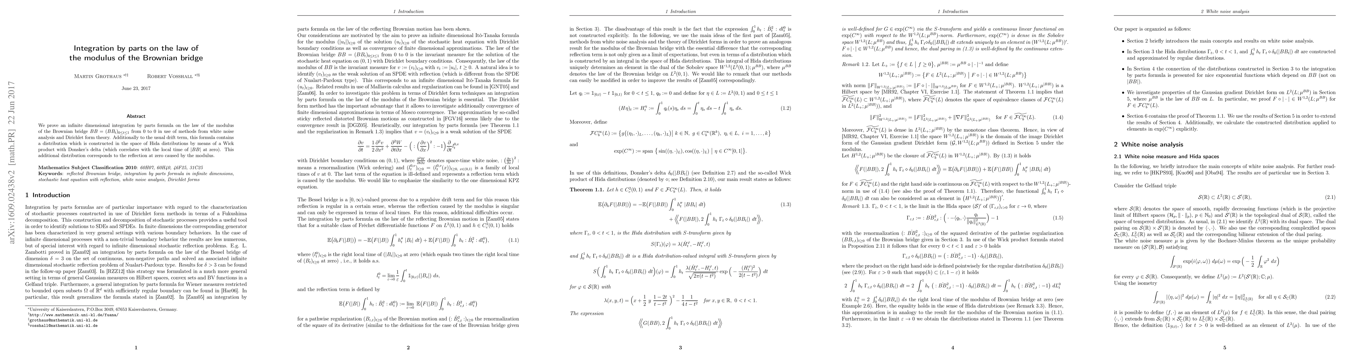 This paper proves an infinite-dimensional integration by parts formula for the modulus of the Brownian bridge, incorporating a drift term and a novel distribution constructed via Hida distributions and Wick products, reflecting the reflection effect at zero.