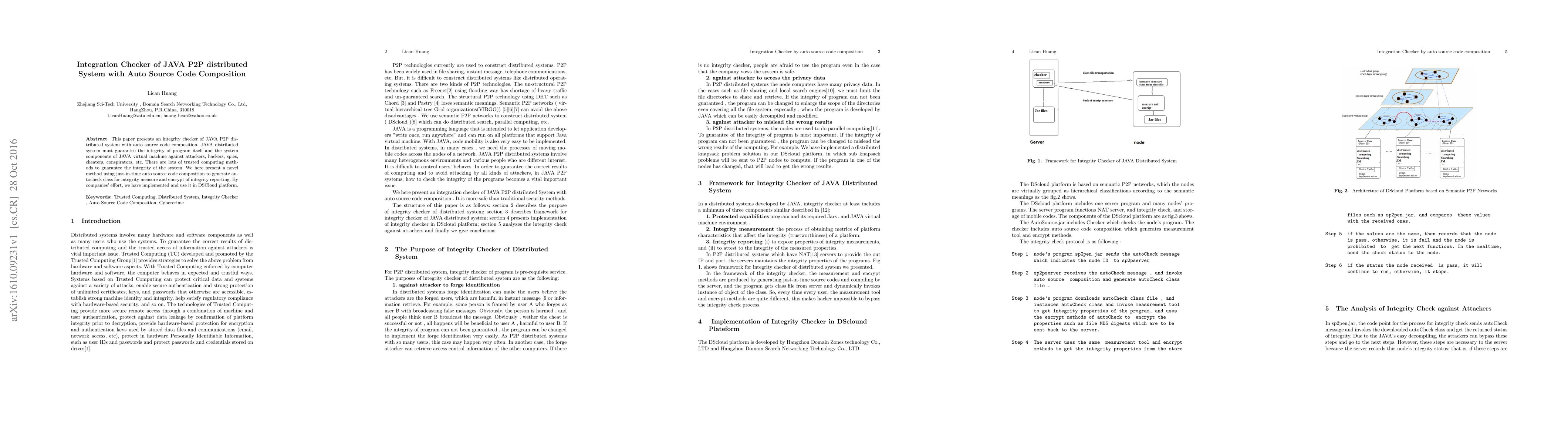 This paper introduces an integrity checker for JAVA P2P distributed systems that employs auto source code composition for real-time integrity checks and encrypted reporting. The method aims to safeguard system components against various threats. The approach has been implemented in the DSCloud platform.