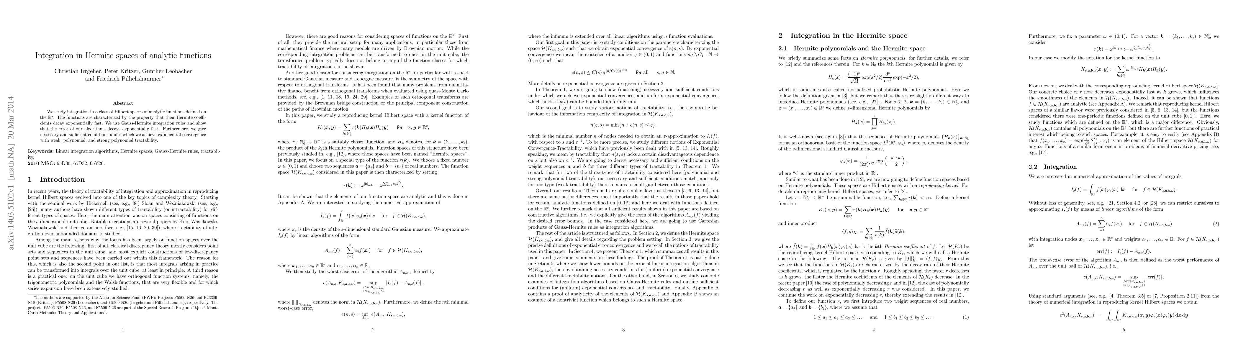 This paper explores integration in Hermite spaces of analytic functions defined on $\mathbb{R}^s$, demonstrating that Gauss-Hermite integration rules yield exponentially decaying error. It also provides conditions for exponential convergence with polynomial tractability.