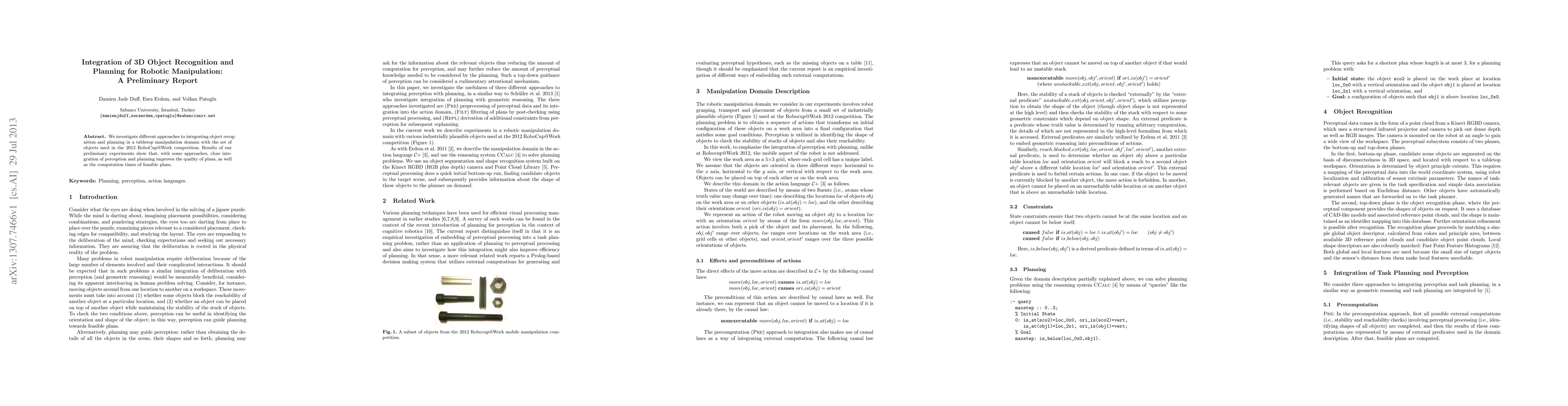This paper explores methods to combine 3D object recognition with planning for robotic manipulation, using objects from the 2012 RoboCup@Work competition. Preliminary results indicate that tightly integrating perception and planning enhances both plan quality and computational efficiency.