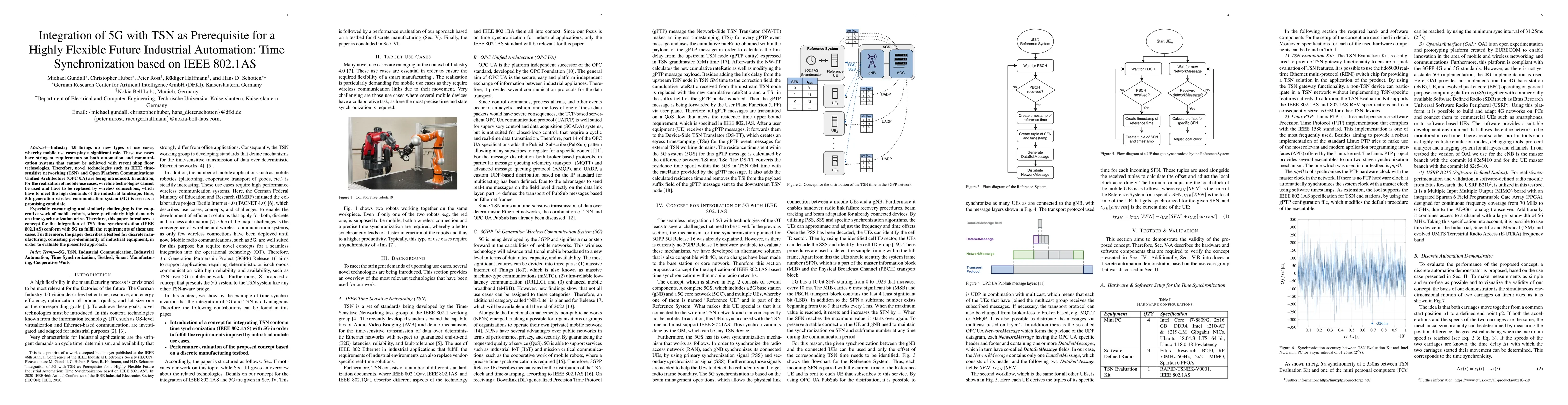 This paper explores integrating 5G with Time Sensitive Networking (TSN) to support flexible industrial automation, focusing on time synchronization for mobile robots and discrete manufacturing applications.