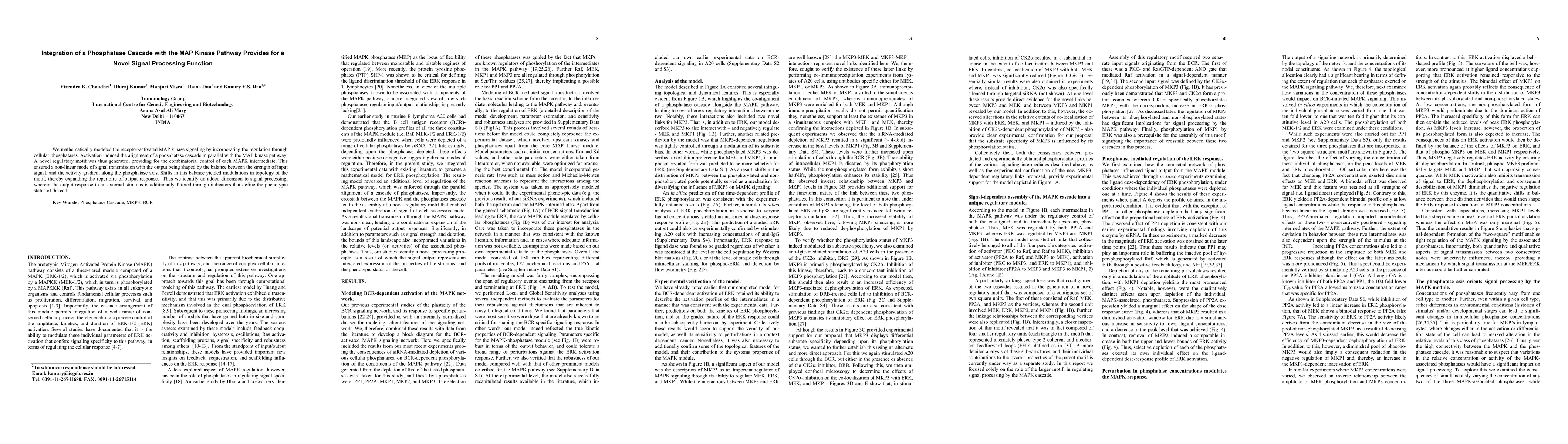We mathematically modeled the receptor-activated MAP kinase signaling by incorporating the regulation through cellular phosphatases. Activation induced the alignment of a phosphatase cascade in parallel with the MAP kinase pathway. A novel regulatory motif was thus generated, providing for the combinatorial control of each MAPK intermediate. This ensured a non-linear mode of signal transmission with the output being shaped by the balance between the strength of input signal, and the activity gradient along the phosphatase axis. Shifts in this balance yielded modulations in topology of the motif, thereby expanding the repertoire of output responses. Thus we identify an added dimension to signal processing, wherein the output response to an external stimulus is additionally filtered through indicators that define the phenotypic status of the cell.