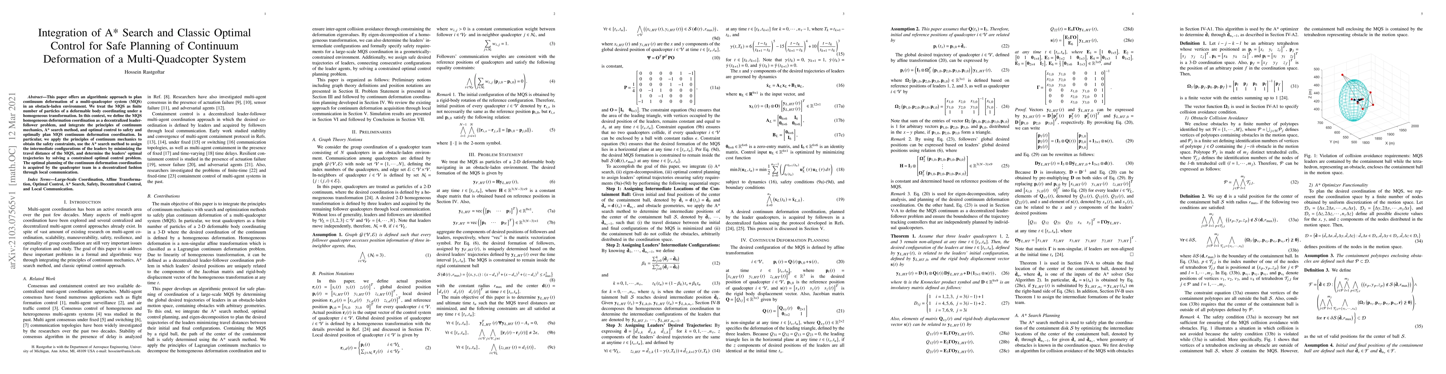 Researchers developed an algorithm for safe planning of a multi-quadcopter system's continuum deformation in obstacle-laden environments using A-Star search and optimal control. The approach enables decentralized coordination through local communication, ensuring safe and efficient flight planning.