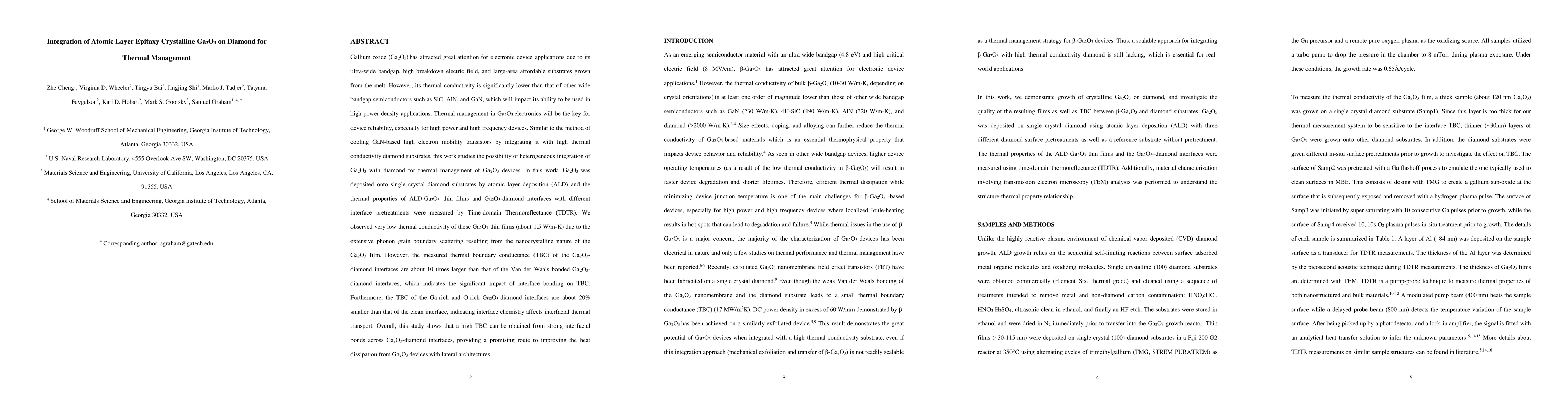 This study explores integrating Ga2O3 deposited via Atomic Layer Epitaxy onto diamond substrates to enhance thermal management in Ga2O3 electronic devices. The thermal boundary conductance at Ga2O3-diamond interfaces was found to be significantly improved by strong interfacial bonding, suggesting a promising method to enhance heat dissipation in Ga2O3 devices.