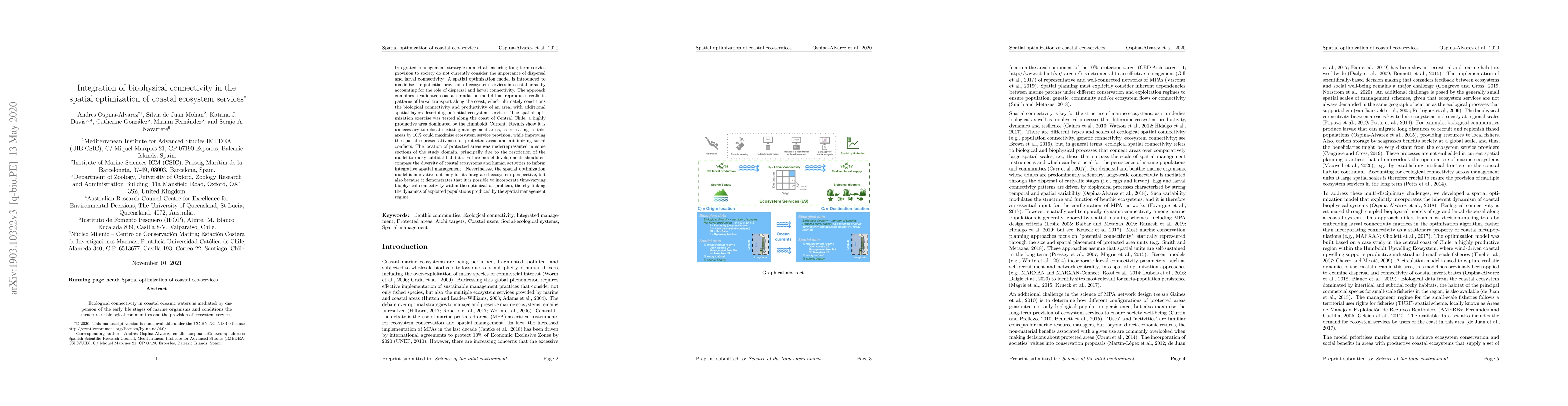 This paper introduces a spatial optimization model to maximize coastal ecosystem services by integrating biophysical connectivity, specifically larval dispersal, into management strategies. The model, tested along Central Chile's coast, shows that increasing no-take areas by 10% can optimize service provision while minimizing conflicts and enhancing the spatial representativeness of protected areas.