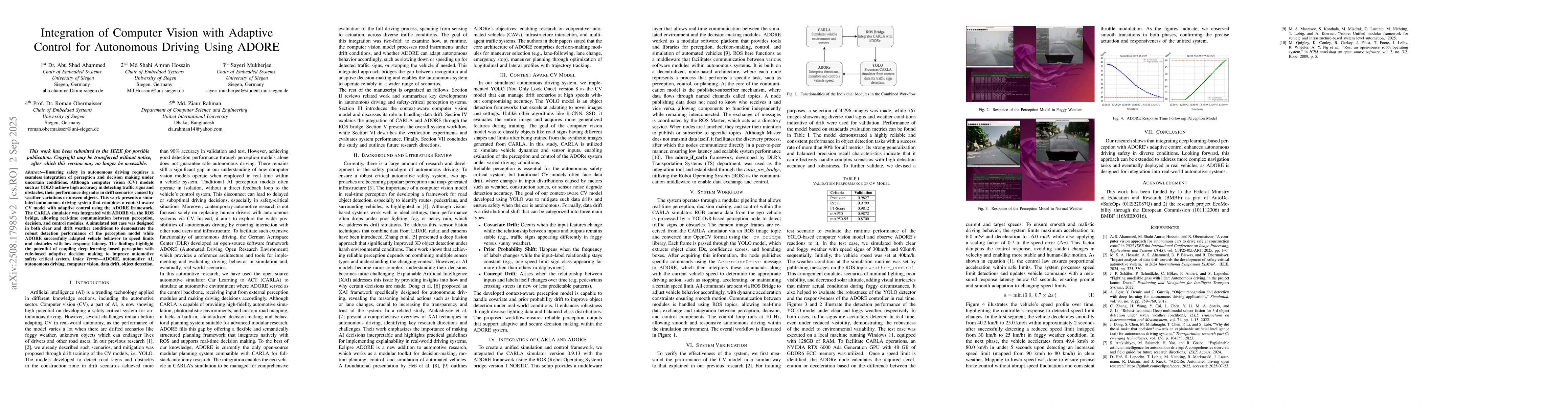 Ensuring safety in autonomous driving requires a seamless integration of perception and decision making under uncertain conditions. Although computer vision (CV) models such as YOLO achieve high accuracy in detecting traffic signs and obstacles, their performance degrades in drift scenarios caused by weather variations or unseen objects. This work presents a simulated autonomous driving system that combines a context aware CV model with adaptive control using the ADORE framework. The CARLA simulator was integrated with ADORE via the ROS bridge, allowing real-time communication between perception, decision, and control modules. A simulated test case was designed in both clear and drift weather conditions to demonstrate the robust detection performance of the perception model while ADORE successfully adapted vehicle behavior to speed limits and obstacles with low response latency. The findings highlight the potential of coupling deep learning-based perception with rule-based adaptive decision making to improve automotive safety critical system.
