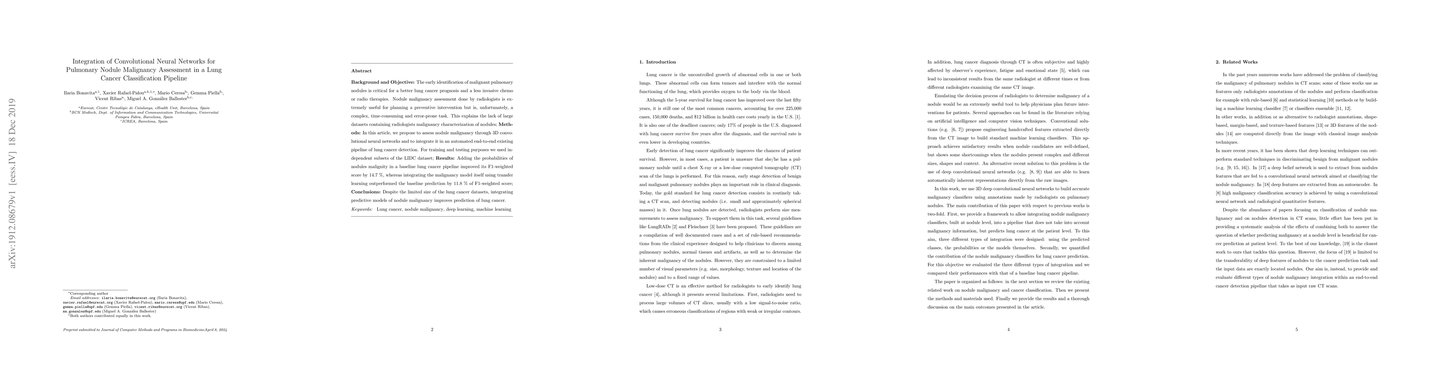 This paper proposes using 3D convolutional neural networks to assess pulmonary nodule malignancy, integrating it into an existing lung cancer detection pipeline. The integration improved the pipeline's F1-weighted score by 14.7%, and using transfer learning further enhanced the prediction by 11.8%.