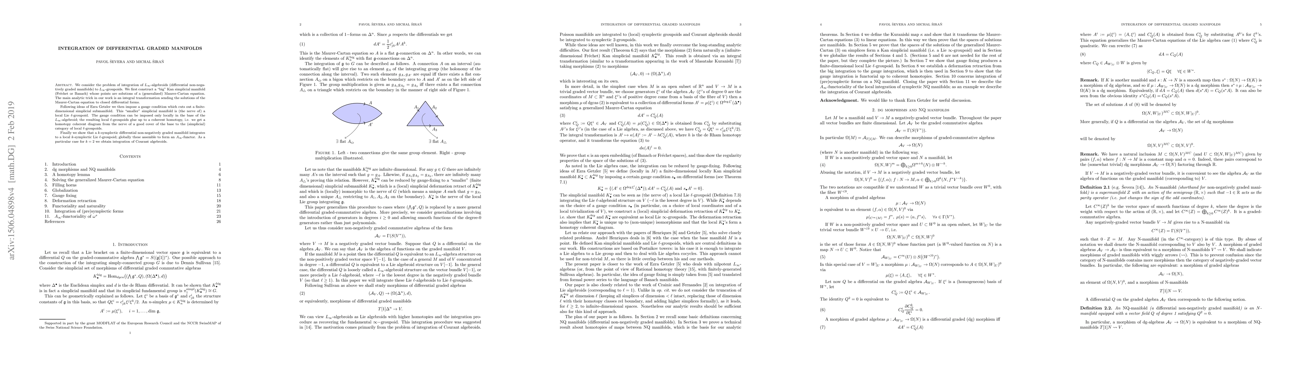 We consider the problem of integration of L_\infty-algebroids (differential graded manifolds) to L_\infty-groupoids. We first construct a "big" Kan simplicial manifold (Fr\'echet or Banach) whose points are solutions of a (generalized) Maurer-Cartan equation. The main analytic trick in our work is an integral transformation sending the solutions of the Maurer-Cartan equation to closed differential forms. Following ideas of Ezra Getzler we then impose a gauge condition which cuts out a finite-dimensional simplicial submanifold. This "smaller" simplicial manifold is (the nerve of) a local Lie k-groupoid. The gauge condition can be imposed only locally in the base of the L_\infty-algebroid; the resulting local k-groupoids glue up to a coherent homotopy, i.e. we get a homotopy coherent diagram from the nerve of a good cover of the base to the (simplicial) category of local Lie k-groupoids. Finally we show that a m-symplectic differential graded manifold integrates to a local m-symplectic Lie k-groupoid; globally these assemble to form an A_\infty-functor. As a particular case for m=2 we obtain integration of Courant algebroids.