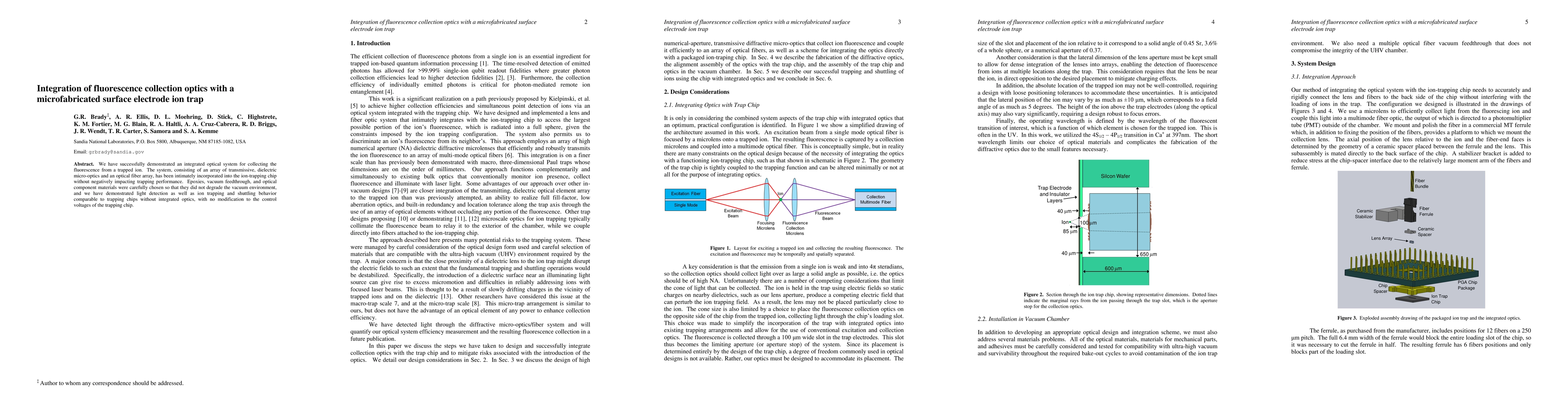 This paper demonstrates the integration of fluorescence collection optics with a microfabricated surface electrode ion trap, successfully incorporating an array of micro-optics and an optical fiber without compromising trapping performance or vacuum integrity. The system maintains comparable ion trapping and shuttling behavior to non-integrated systems.