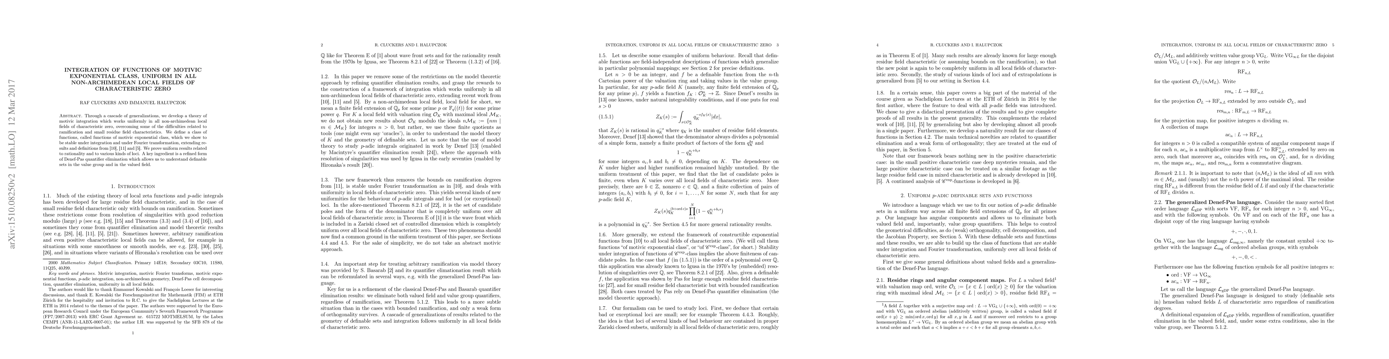 This paper develops a theory of motivic integration that works uniformly across all non-archimedean local fields of characteristic zero, addressing challenges like ramification and small residue fields. It introduces functions of motivic exponential class, proving their stability under integration and Fourier transformation, and establishes uniform rationality and locus results.