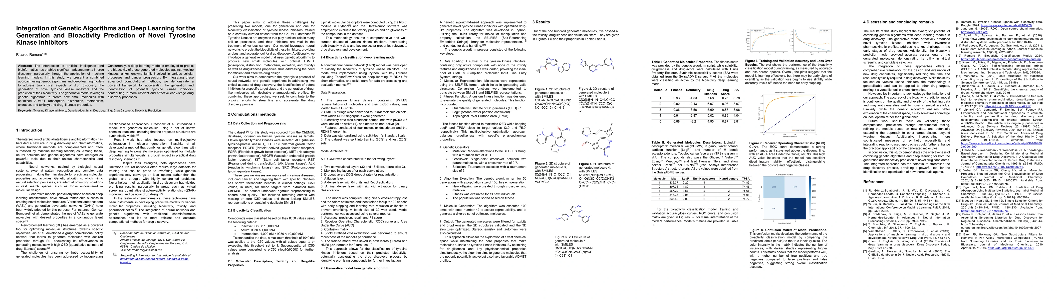 This paper combines genetic algorithms and deep learning to generate novel tyrosine kinase inhibitors and predict their bioactivity, showcasing a potent framework for enhancing early-stage drug discovery and optimizing molecule properties.
