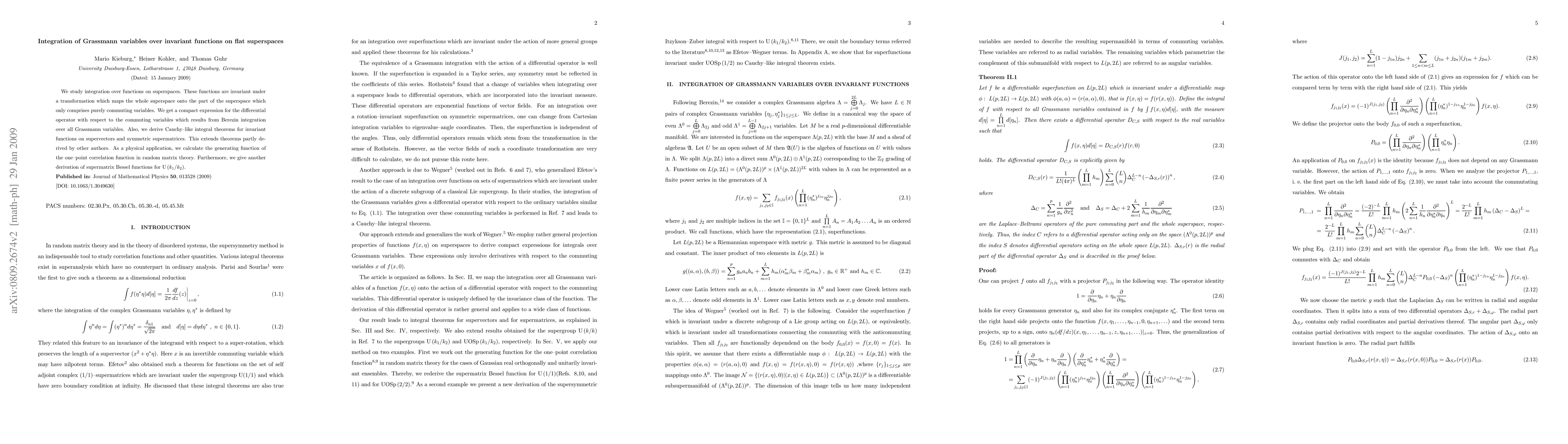 We study integration over functions on superspaces. These functions are invariant under a transformation which maps the whole superspace onto the part of the superspace which only comprises purely commuting variables. We get a compact expression for the differential operator with respect to the commuting variables which results from Berezin integration over all Grassmann variables. Also, we derive Cauchy--like integral theorems for invariant functions on supervectors and symmetric supermatrices. This extends theorems partly derived by other authors. As an physical application, we calculate the generating function of the one--point correlation function in random matrix theory. Furthermore, we give another derivation of supermatrix Bessel--functions for U(k_1/k_2).