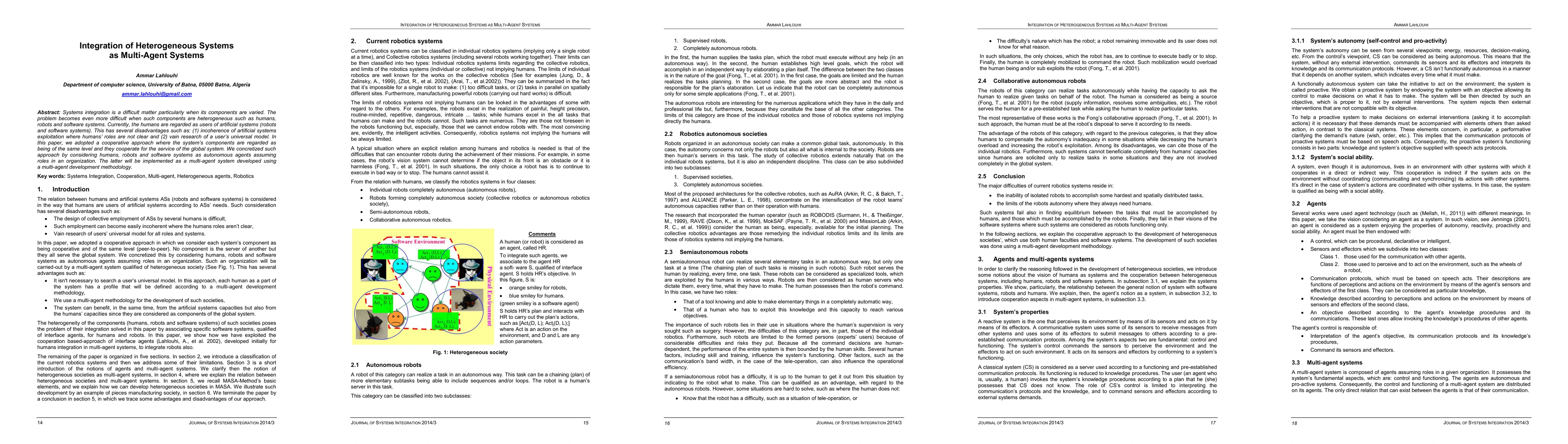 This paper proposes a cooperative approach to integrating heterogeneous systems by treating humans, robots, and software as autonomous agents within a multi-agent system, aiming to resolve the incoherence of artificial systems exploitation and eliminate the search for a universal user model. The methodology will be implemented using a multi-agent development framework.