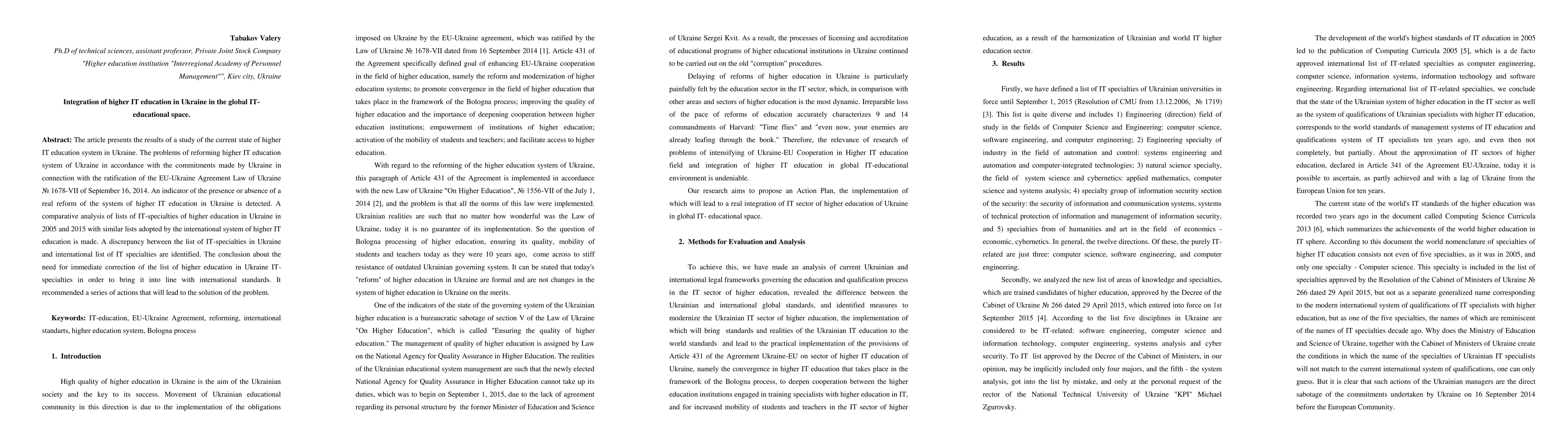 The study examines the current state of higher IT education in Ukraine and identifies discrepancies between its IT-specialties and international standards, recommending reforms to align with global IT-educational practices. Immediate corrective actions are proposed to address these discrepancies and align Ukraine's IT education system with international norms.