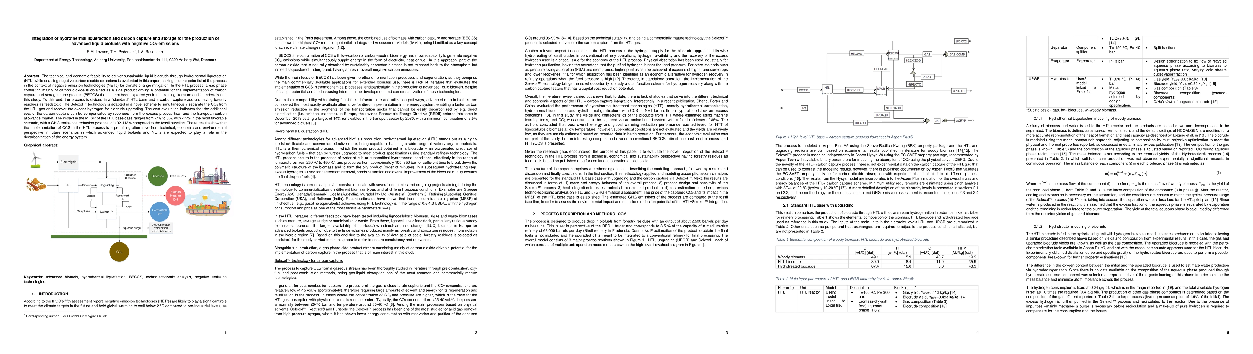 This study evaluates the feasibility of integrating carbon capture and storage (CCS) with hydrothermal liquefaction (HTL) to produce advanced biofuels with negative CO2 emissions. Utilizing forestry residues as feedstock, the Selexol technology is adapted to capture CO2 and recover hydrogen for biocrude upgrading. The results indicate that the additional CCS cost can be offset by revenues from process heat and the carbon market, with a potential for a 102-113% reduction in greenhouse gas emissions compared to fossil fuels. The implementation of CCS in HTL is considered promising from technical, economic, and environmental perspectives for future decarbonization scenarios.