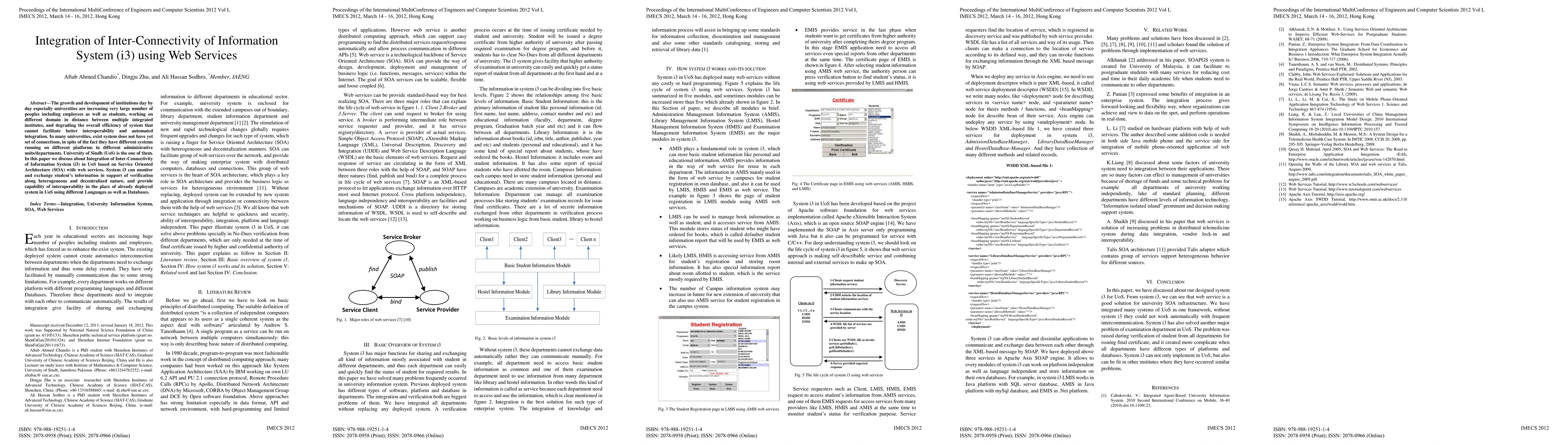 The growth and development of institutions day by day especially universities are increasing very large number of peoples including employees as well as students, working on different domain in distance between multiple integrated institutes, and degrading the overall efficiency of system that cannot facilitate better interoperability and automated integration. In many universities, exist system does not have yet set of connections, in spite of the fact they have different systems running on different platforms in different administrative units or departments. University of Sindh (UoS) is the one of them. In this paper we discuss about Integration of Inter-Connectivity of Information System (i3) in the UoS which is based on Service Oriented Architecture with web services. The proposed system (i3) can monitor and exchange students information in support of verification along heterogeneous and decentralized nature, and provide capability of interoperability in the place of already deployed system in the UoS using different Languages as well as Databases.
