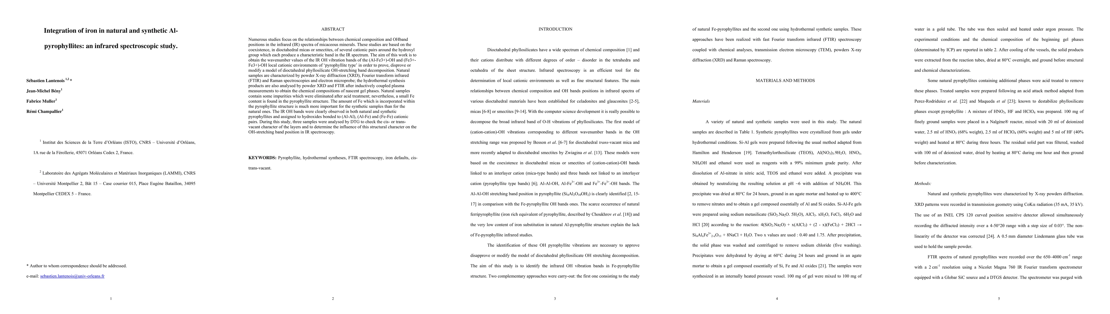 Numerous studies focus on the relationships between chemical composition and OHband positions in the infrared (IR) spectra of micaceous minerals. These studies are based on the coexistence, in dioctahedral micas or smectites, of several cationic pairs around the hydroxyl group which each produce a characteristic band in the IR spectrum. The aim of this work is to obtain the wavenumber values of the IR OH vibration bands of the (Al-Fe3+)-OH and (Fe3+-Fe3+)-OH local cationic environments of 'pyrophyllite type' in order to prove, disprove or modify a model of dioctahedral phyllosilicate OH-stretching band decomposition. Natural samples are characterized by powder X-ray diffraction (XRD), Fourier transform infrared (FTIR) and Raman spectroscopies and electron microprobe; the hydrothermal synthesis products are also analysed by powder XRD and FTIR after inductively coupled plasma measurements to obtain the chemical compositions of nascent gel phases. Natural samples contain some impurities which were eliminated after acid treatment; nevertheless, a small Fe content is found in the pyrophyllite structure. The amount of Fe which is incorporated within the pyrophyllite structure is much more important for the synthetic samples than for the natural ones. The IR OH bands were clearly observed in both natural and synthetic pyrophyllites and assigned to hydroxides bonded to (Al-Al), (Al-Fe) and (Fe-Fe) cationic pairs. During this study, three samples were analysed by DTG to check the cis- or trans-vacant character of the layers and to determine the influence of this structural character on the OH-stretching band position in IR spectroscopy.