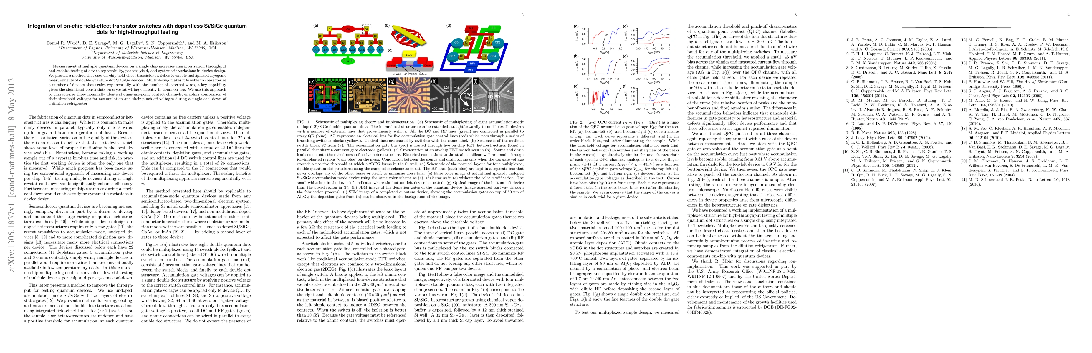 This paper proposes a method to integrate on-chip field-effect transistor switches with dopantless Si/SiGe quantum dots for high-throughput cryogenic testing, enabling multiplexed measurements of multiple quantum devices on a single chip. The approach allows for the characterization of several quantum devices simultaneously, significantly reducing the constraints of traditional cryostat wiring.