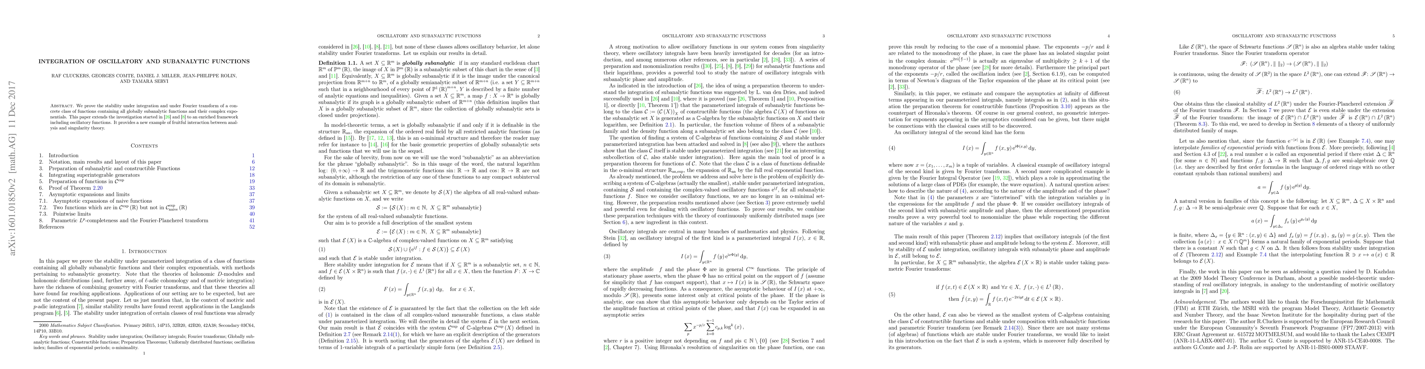 This paper proves the stability under integration and Fourier transform for a class of functions encompassing globally subanalytic functions and their complex exponentials, extending previous work on subanalytic functions and their logarithms. It highlights the interaction between analysis and singularity theory in an enriched framework that includes oscillatory functions.