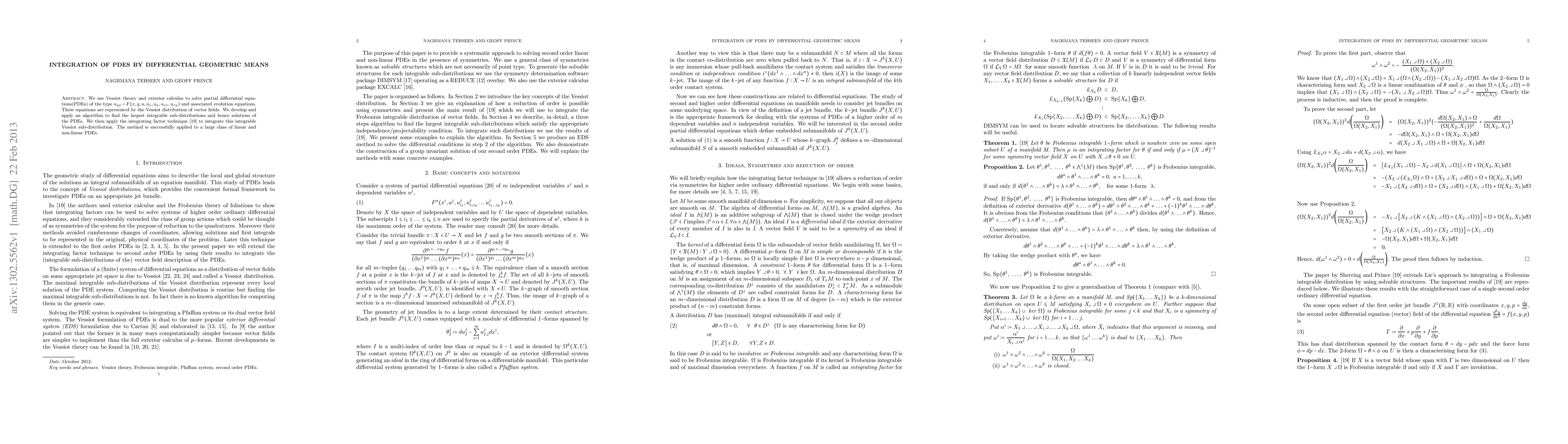 This paper integrates partial differential equations (PDEs) using differential geometric methods, specifically Vessiot theory and exterior calculus, to find solutions for equations of the form uyy = F(x, y,u,ux,uy,uxx,uxy). An algorithm is developed to identify integrable sub-distributions, which are then solved using the integrating factor technique. The method is demonstrated to work for a wide range of linear and non-linear PDEs.