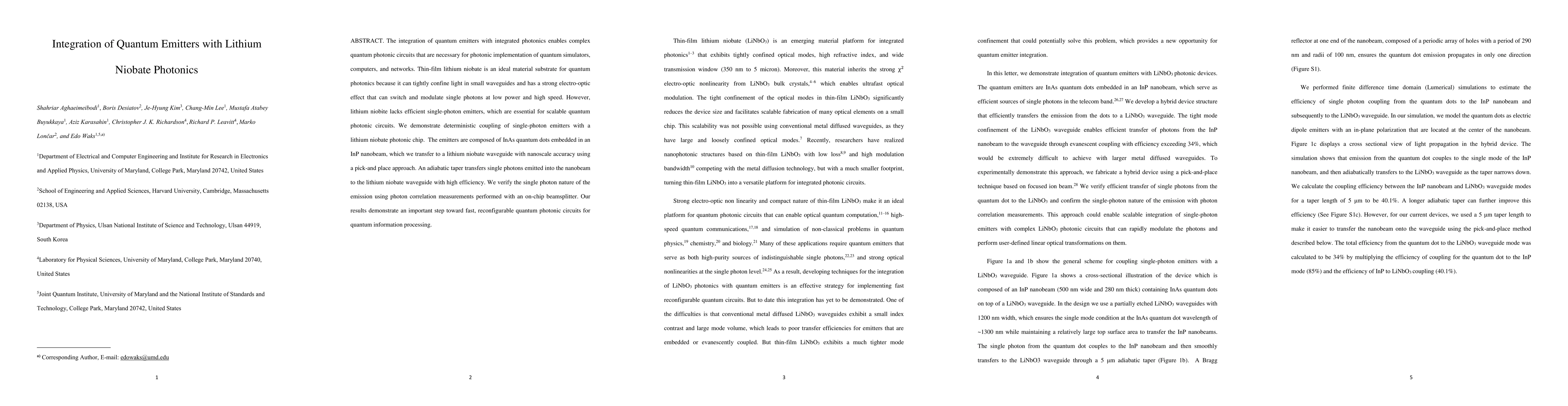 Researchers integrate single-photon emitters with lithium niobate photonic chips for scalable quantum photonic circuits. They utilize InAs quantum dots embedded in InP nanobeams, transferred to lithium niobate waveguides with high precision, achieving efficient single-photon coupling and verification through correlation measurements.
