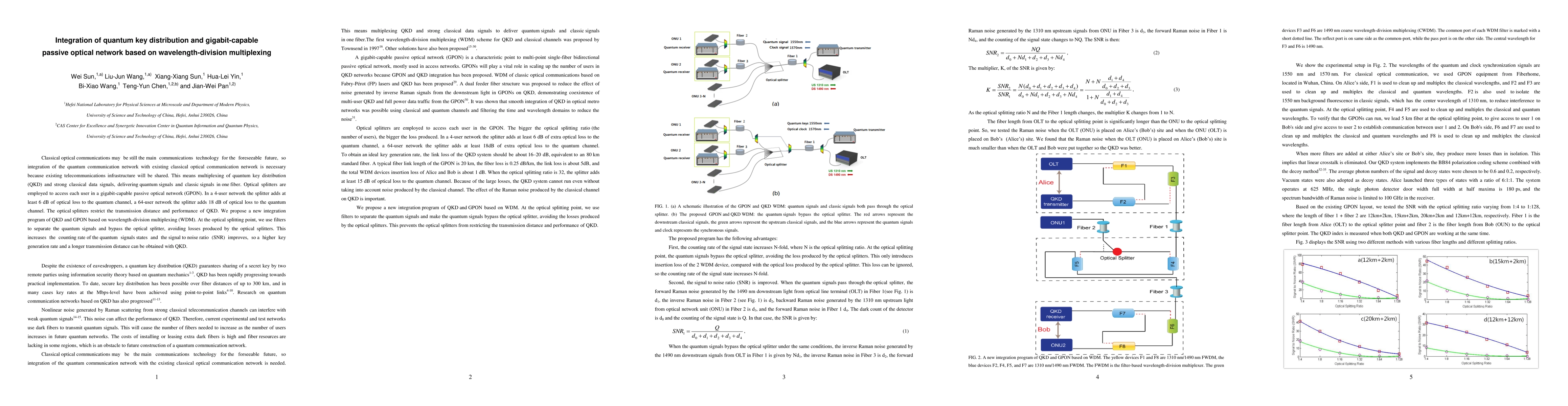 Classical optical communications may be still the main communications technology for the foreseeable future, so integration of the quantum communication network with existing classical optical communication network is necessary because existing telecommunications infrastructure will be shared. This means multiplexing of quantum key distribution (QKD) and strong classical data signals, delivering quantum signals and classic signals in one fiber. Optical splitters are employed to access each user in a gigabit-capable passive optical network (GPON). In a 4-user network the splitter adds at least 6 dB of optical loss to the quantum channel, a 64-user network the splitter adds 18 dB of optical loss to the quantum channel. The optical splitters restrict the transmission distance and performance of QKD. We propose a new integration program of QKD and GPON based on wavelength-division multiplexing (WDM). At the optical splitting point, we use filters to separate the quantum signals and bypass the optical splitter, avoiding losses produced by the optical splitters. This increases the counting rate of the quantum signals states and the signal to noise ratio (SNR) improves, so a higher key generation rate and a longer transmission distance can be obtained with QKD.