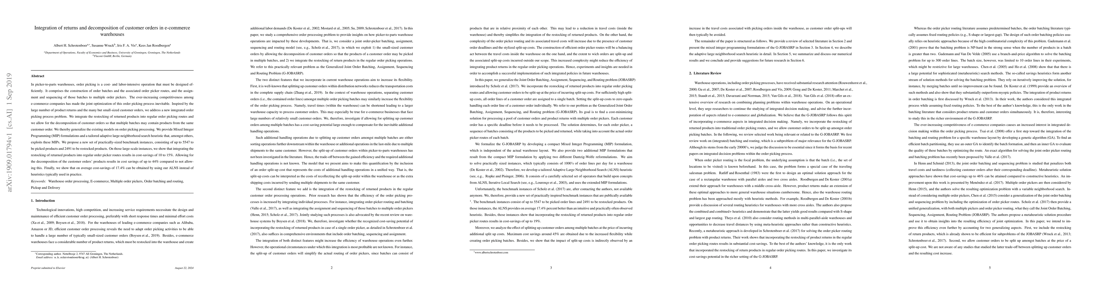 This paper addresses the optimization of order picking in e-commerce warehouses by integrating product returns and decomposing customer orders. The authors propose Mixed Integer Programming formulations and an adaptive large neighborhood search heuristic, demonstrating significant cost savings of up to 44% through decomposition and 10-15% through return integration.